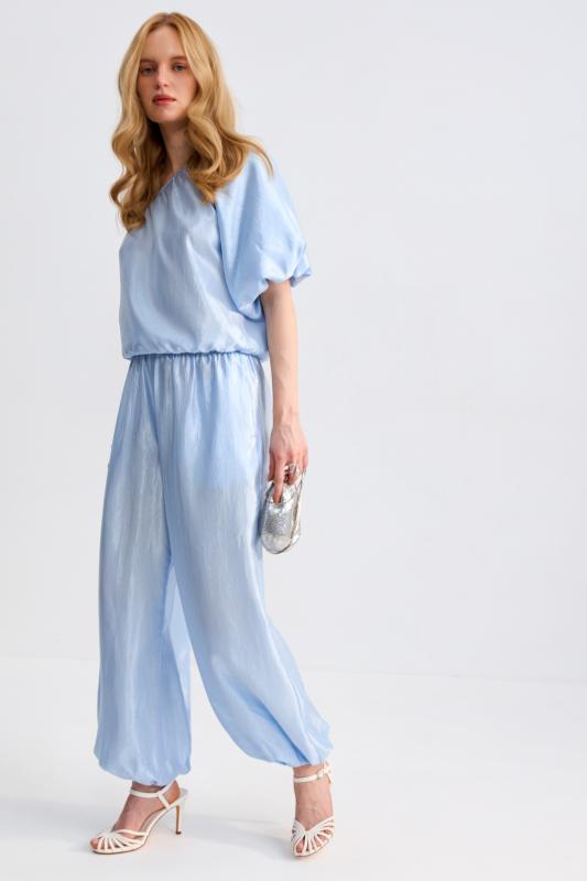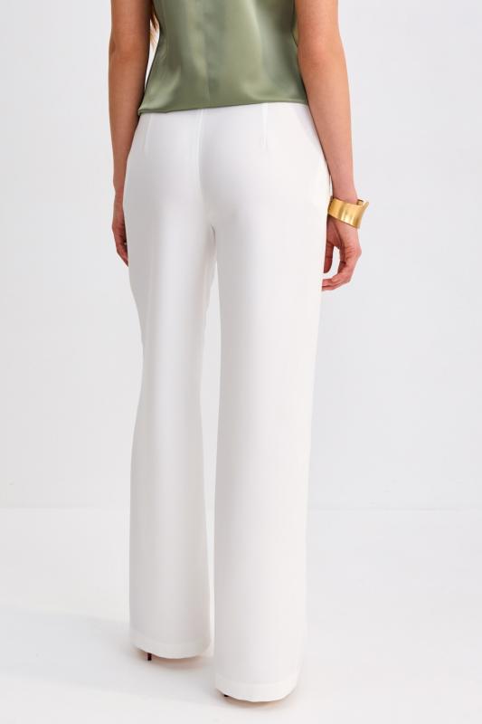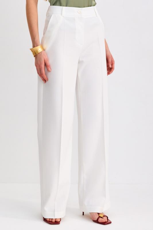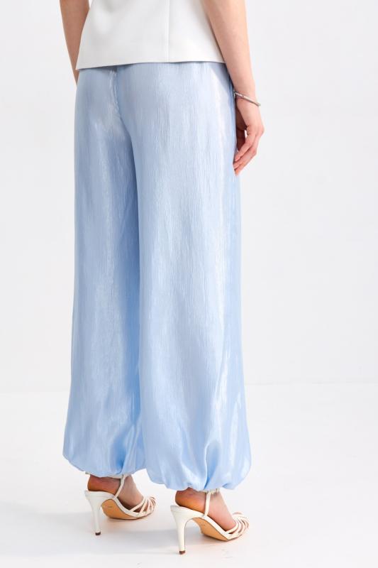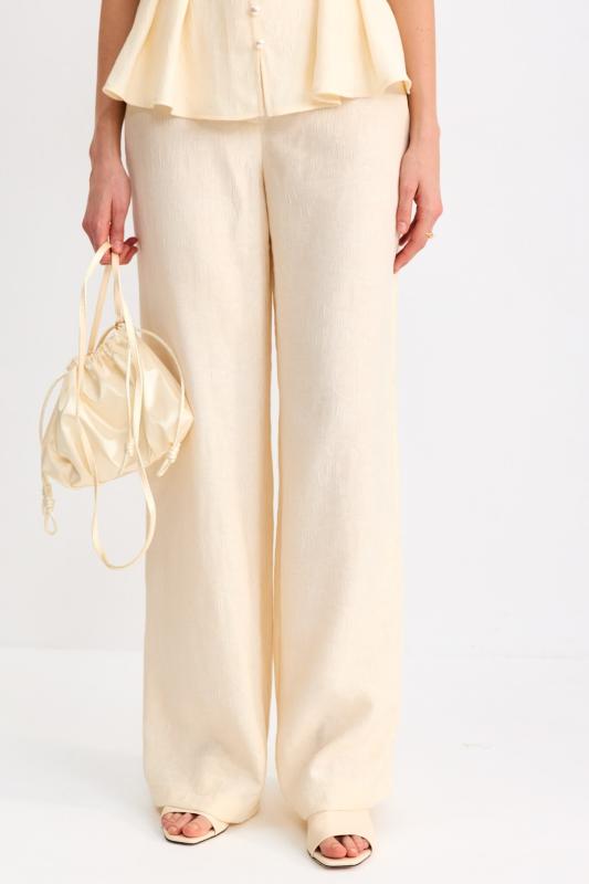 Брюки-палаццо из костюмной поливискозы. Прямые свободные брюки с высокой посадкой. Модель расширена к низу, со шлевками и боковыми карманами.