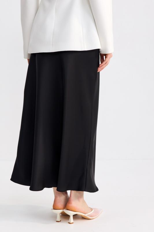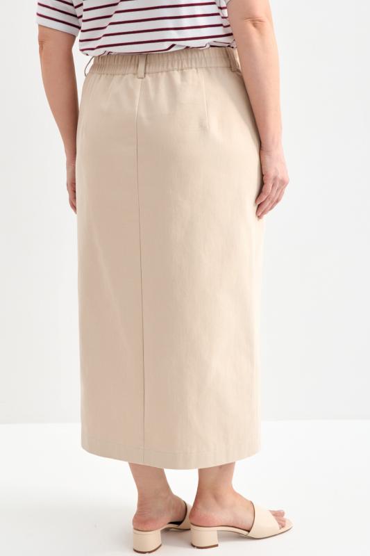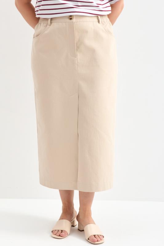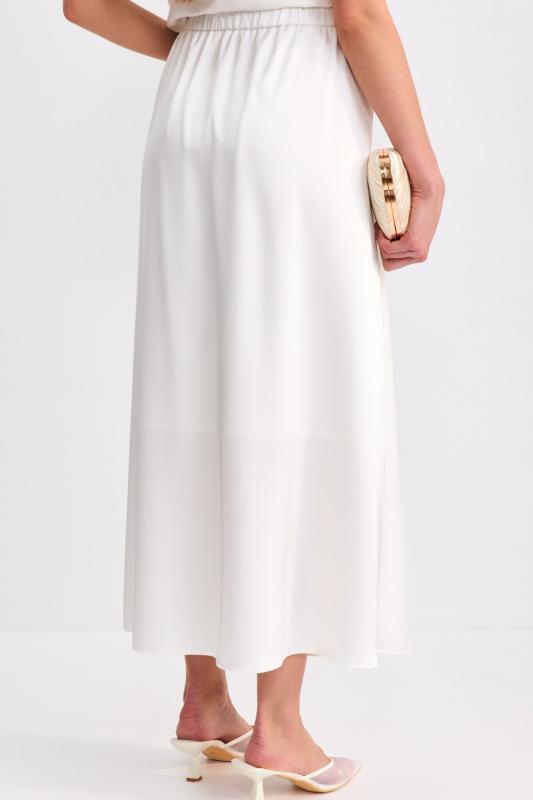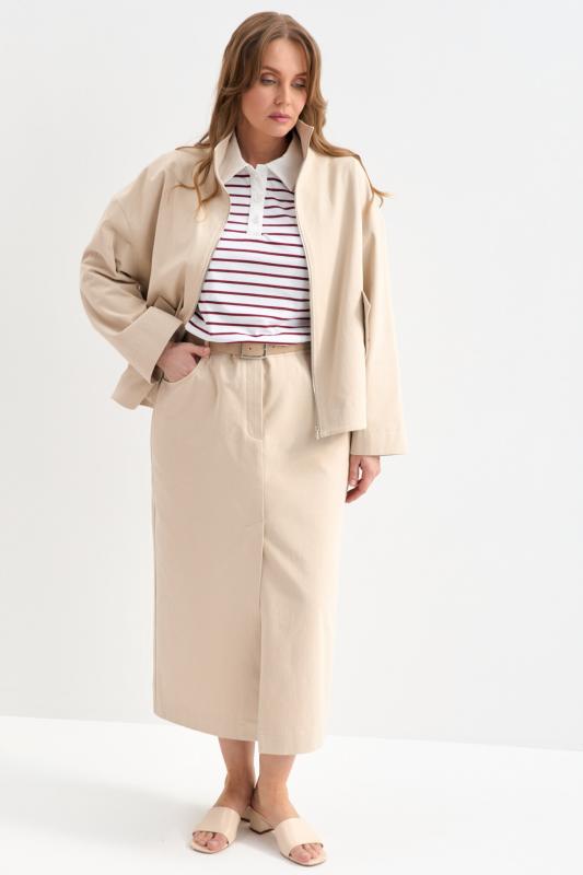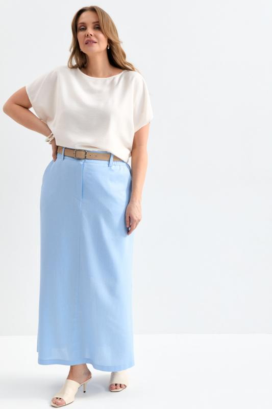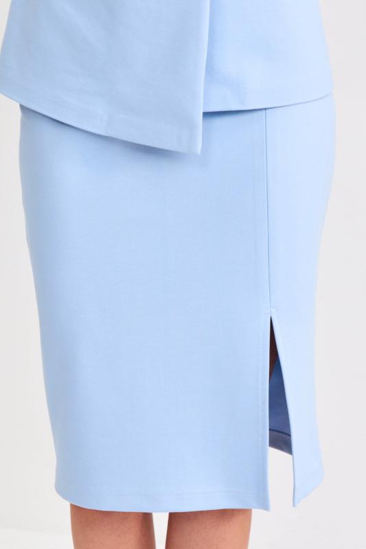 Прямая юбка длины миди из мягкой джинсы. Модель прямого силуэта со шлицей по переду и поясом на резинке. По переду гульфик и застежка на молнию и пуговицу. Шлевки для варианта стилизации с ремнем.