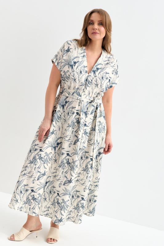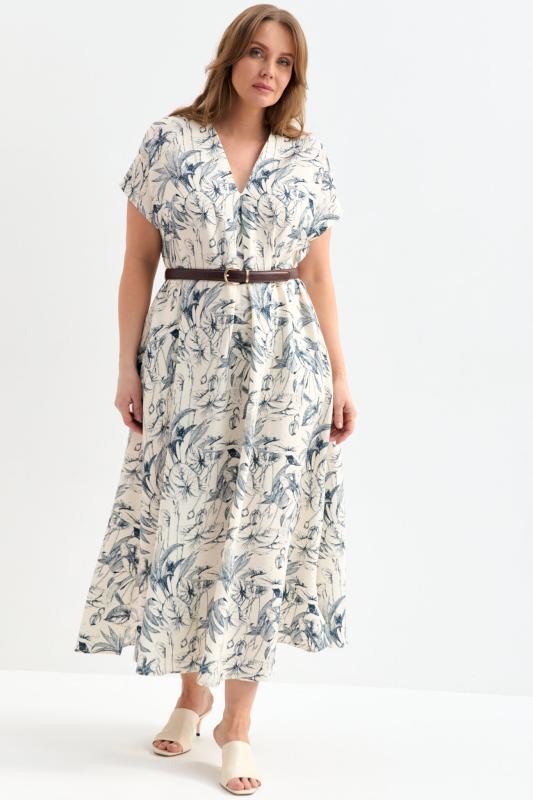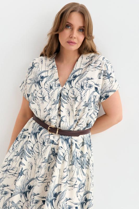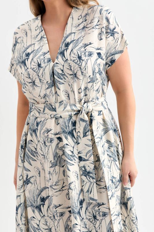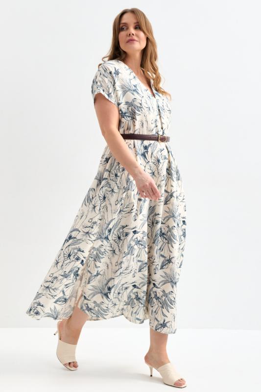 Платье длины миди из фактурной вискозы с принтом. Платье А-силуэта с акцентной складкой по переду. V-образный вырез. В комплекте пояс. В боковых швах деликатные разрезы.