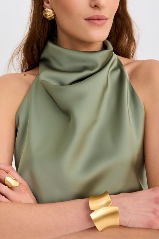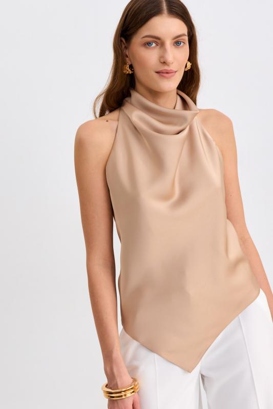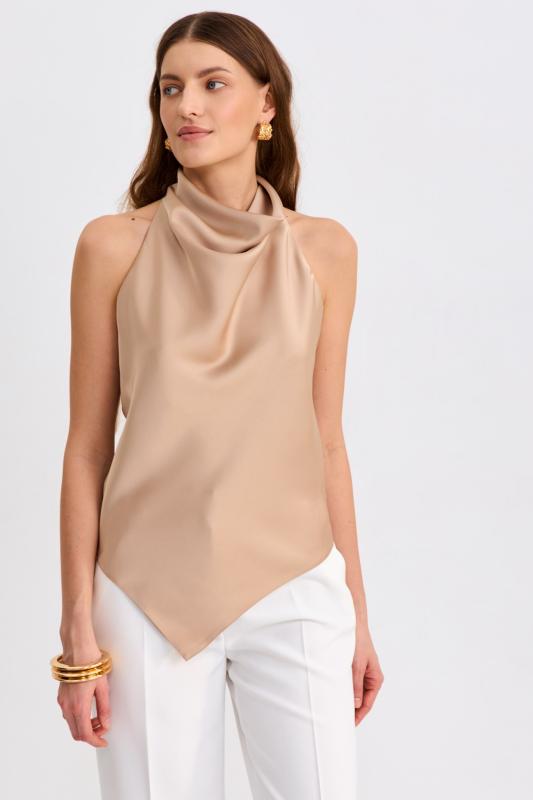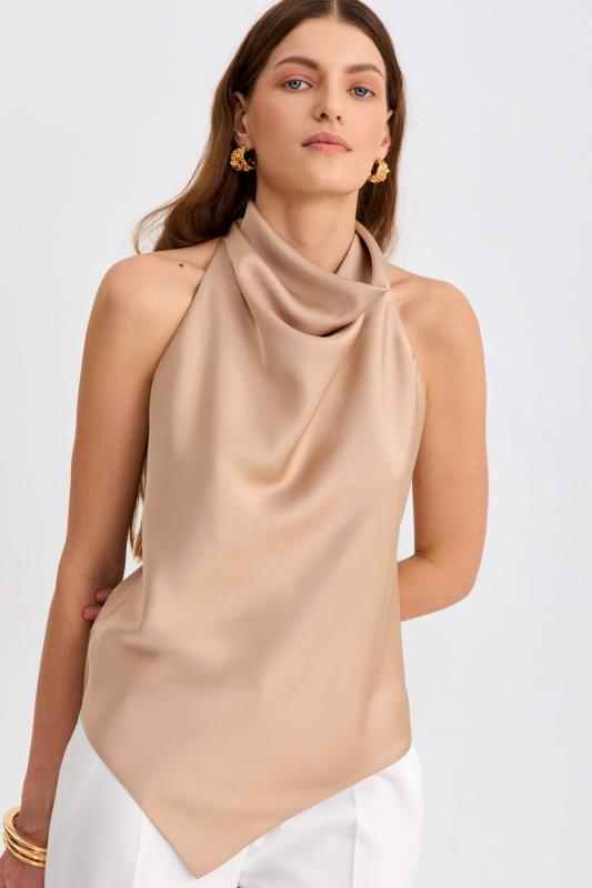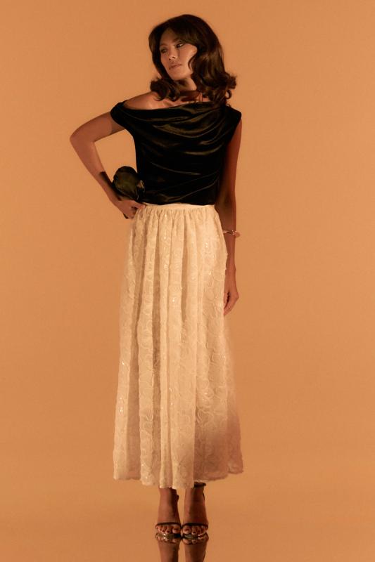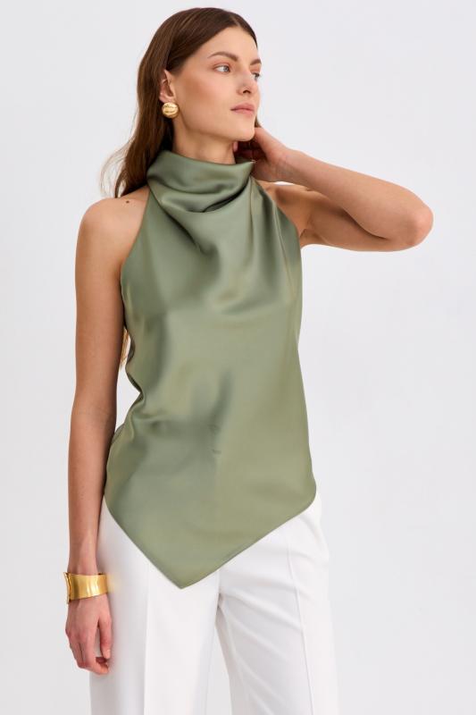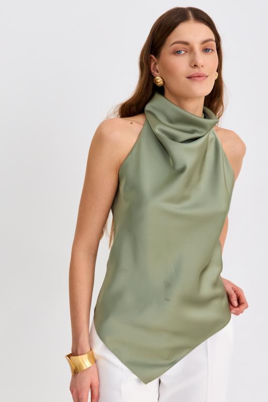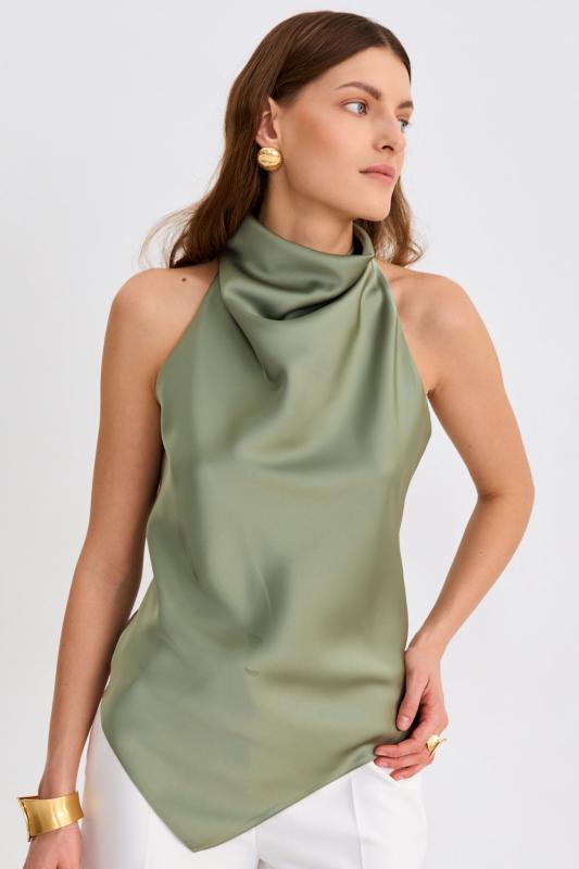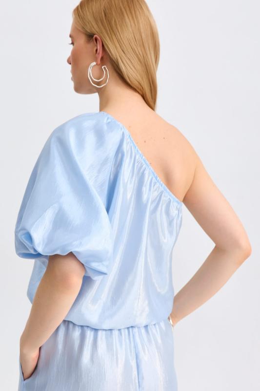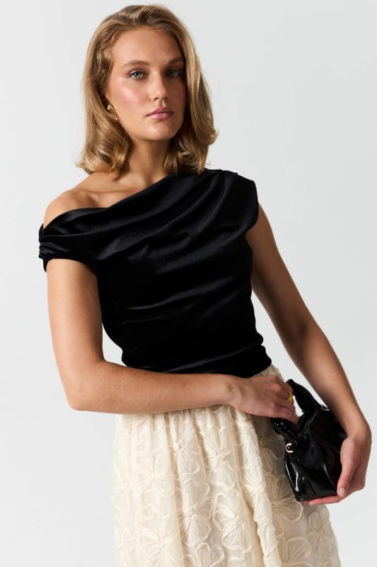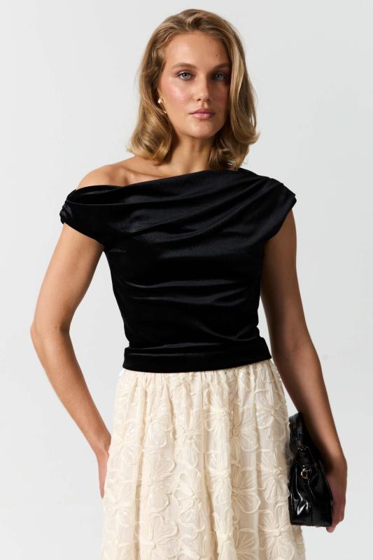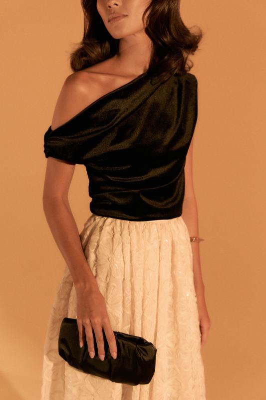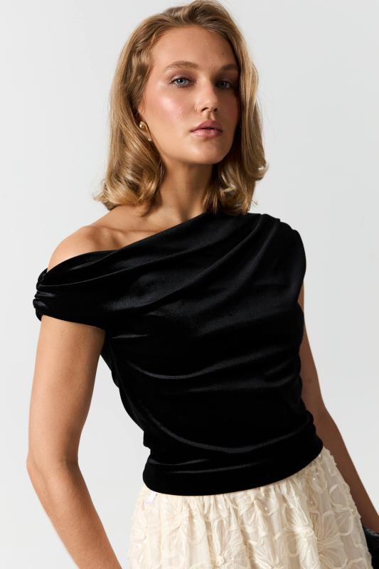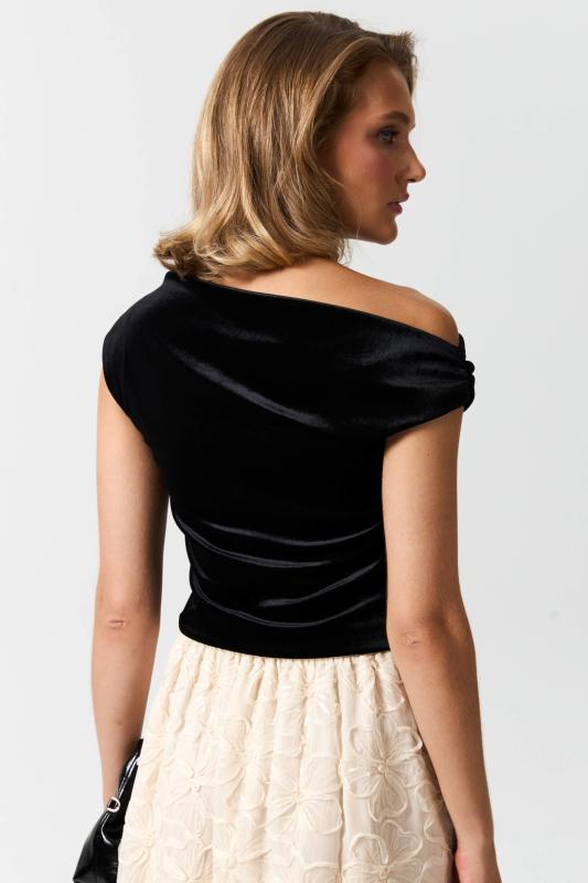 Топ из бархата с асимметричной линией плеча. Модель прилегающего силуэта с асимметричной линией плеч. По переду акцентная драпировка.