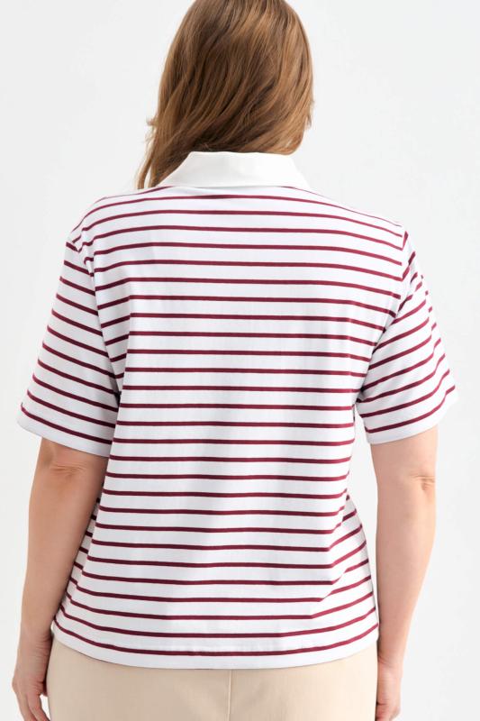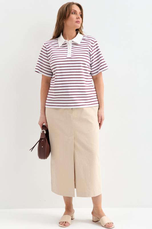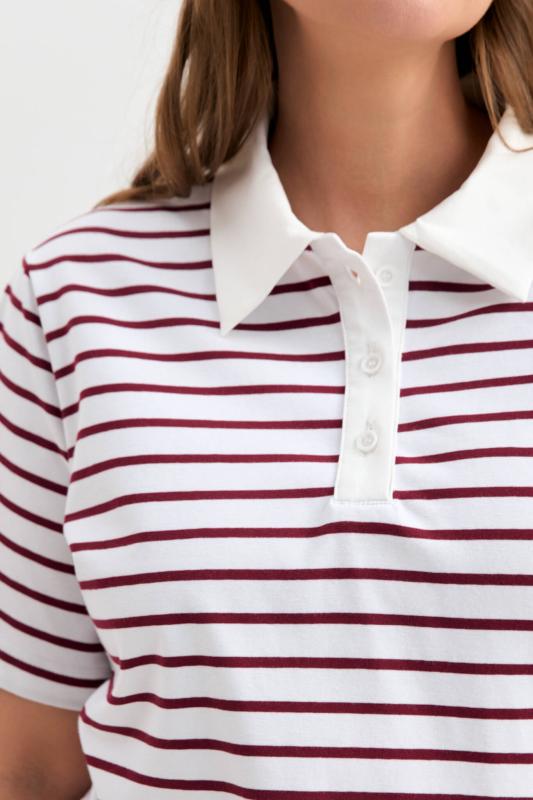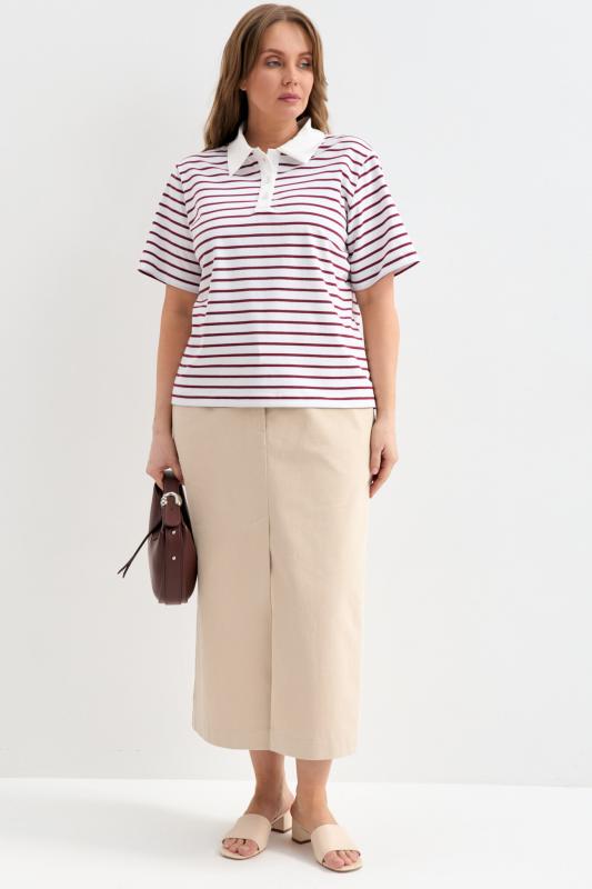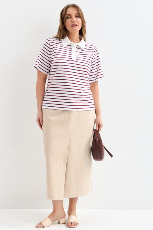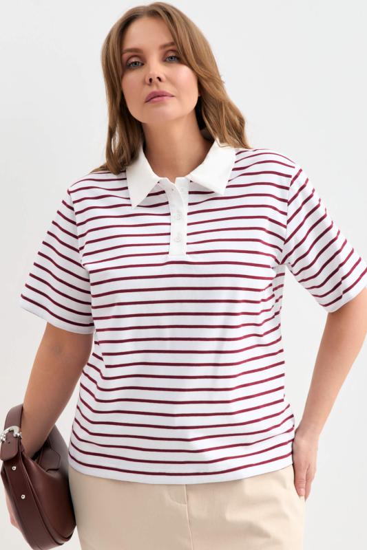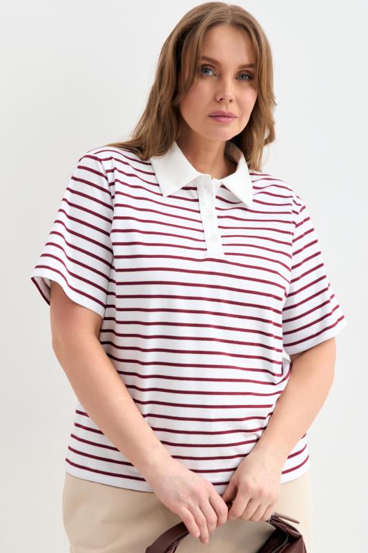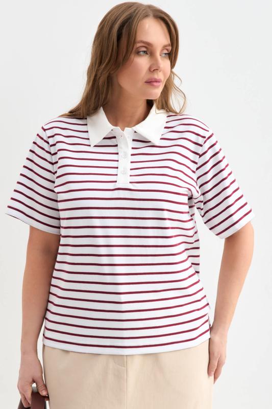 Футболка-поло из трикотажа в контрастную полоску. Модель прямого силуэта. Рукав втачной. Воротник-поло с застежкой на петли и пуговицы.