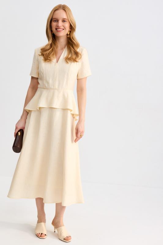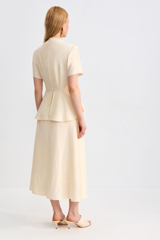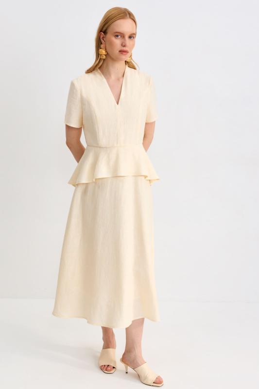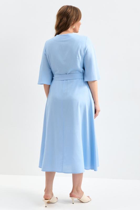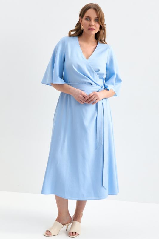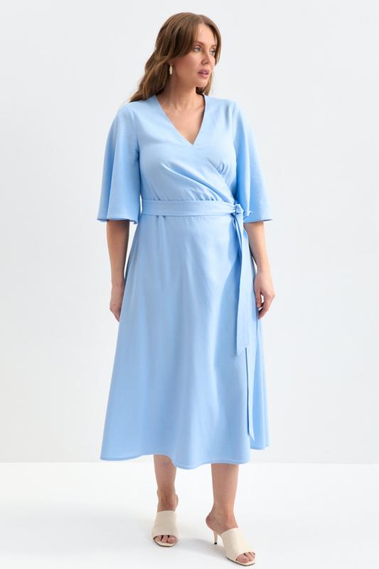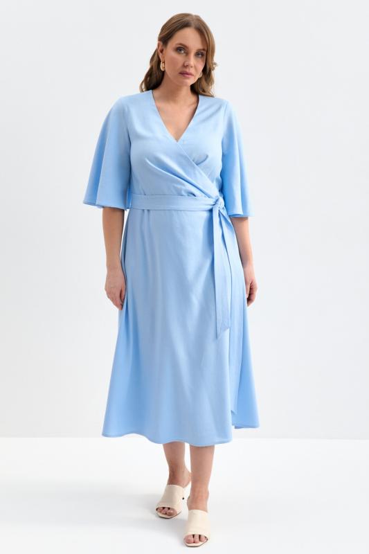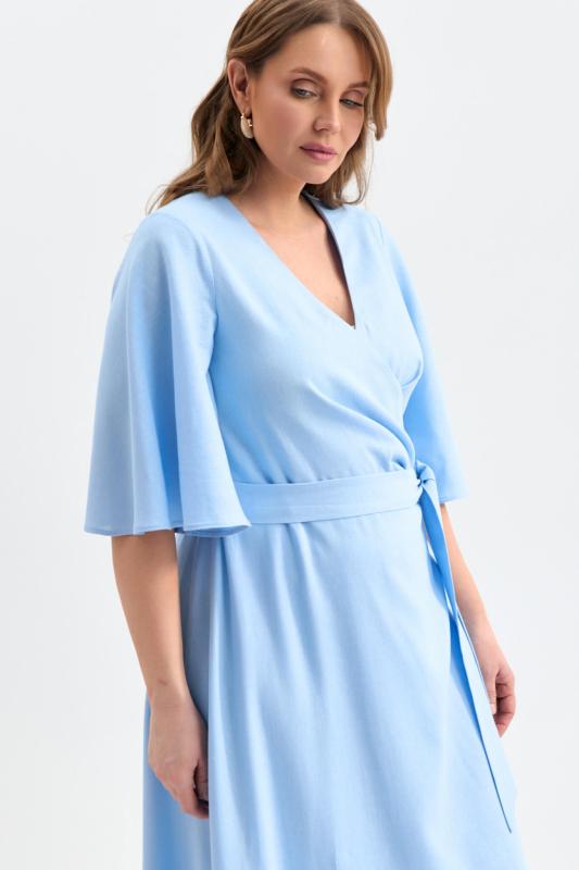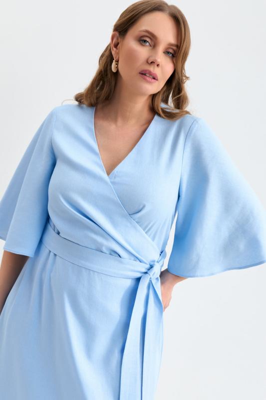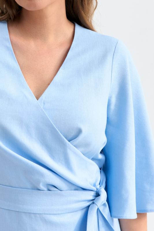 Романтичное платье из льняного полотна. Модель полуприлегающего силуэта на запах. Линия талии отрезная с А-силуэтной юбкой. По переду несколько защипов. Застежка на пояс “халатного” типа с возможностью регулирования запаха. Рукав втачной, расширенный к низу.