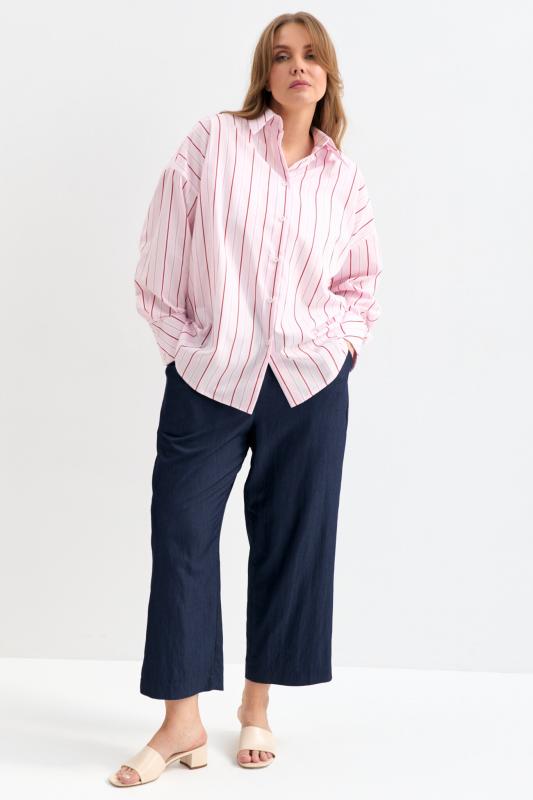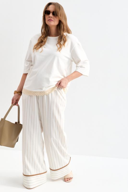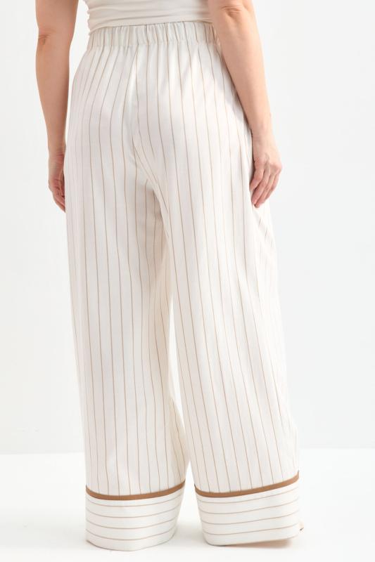 Комфортные брюки из льняного полотна в полоску. Модель свободного силуэта с резинкой и кулиской по поясу. Низ изделия оформлен манжетой с контрастным кантом.