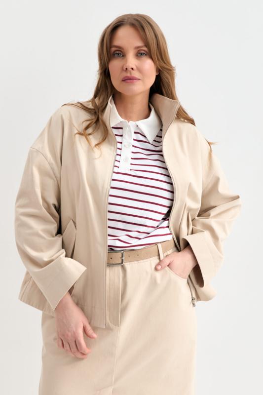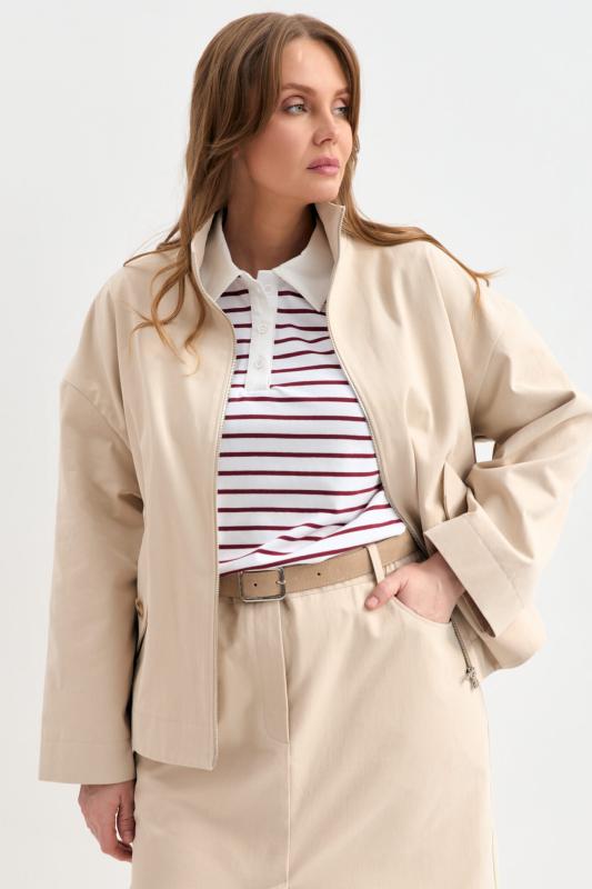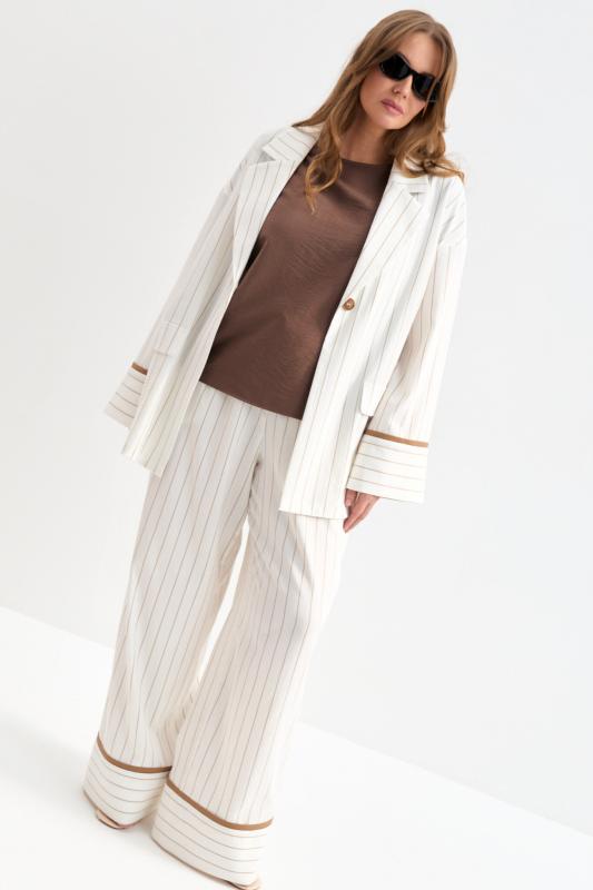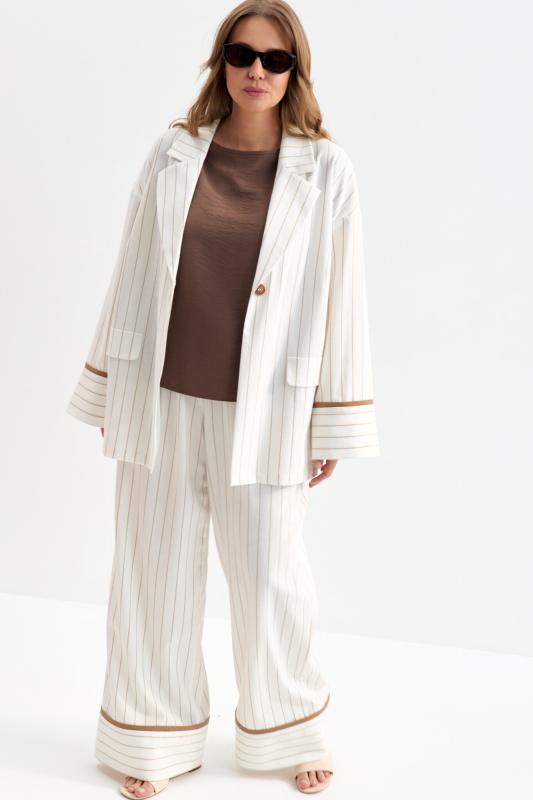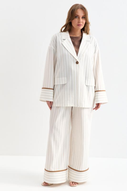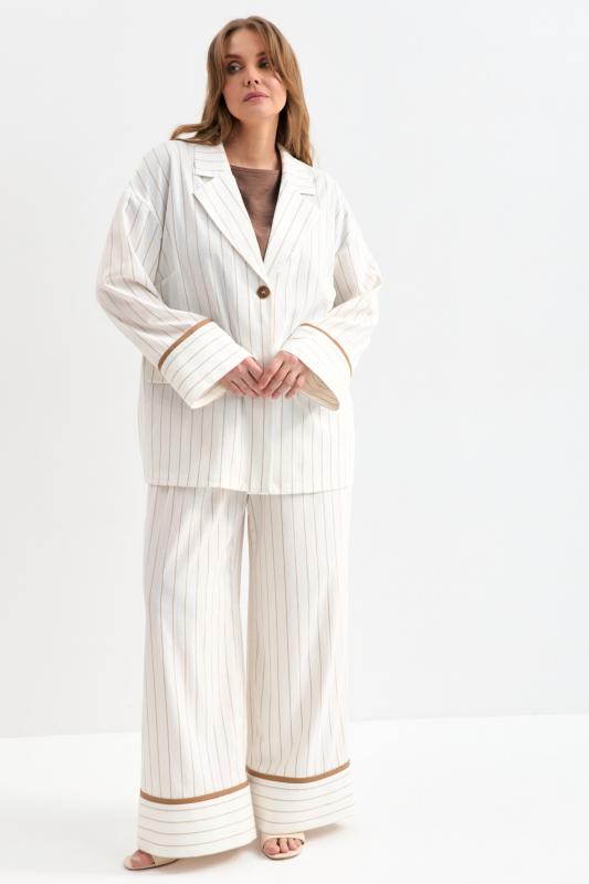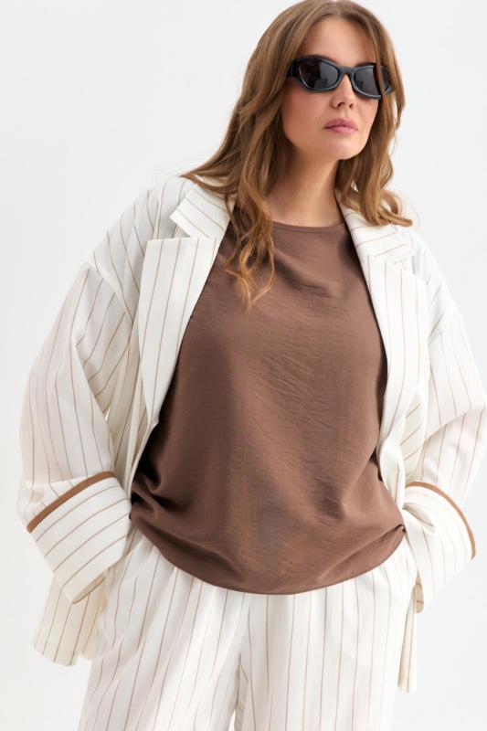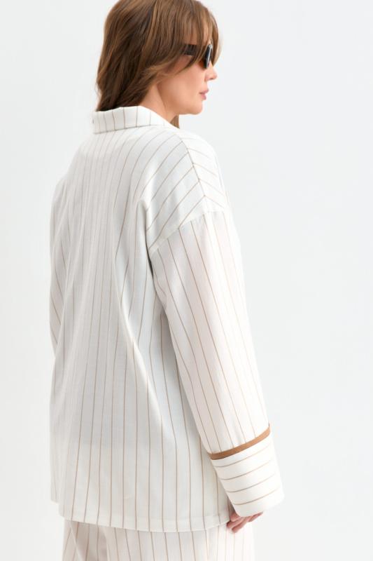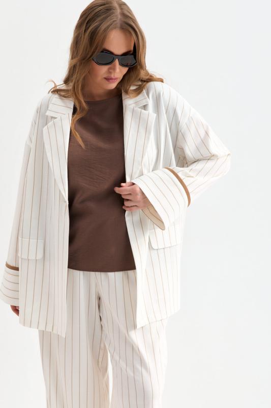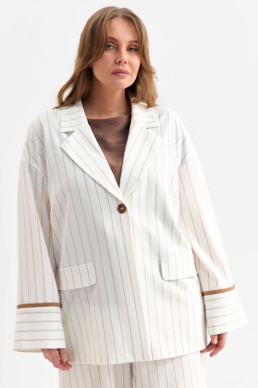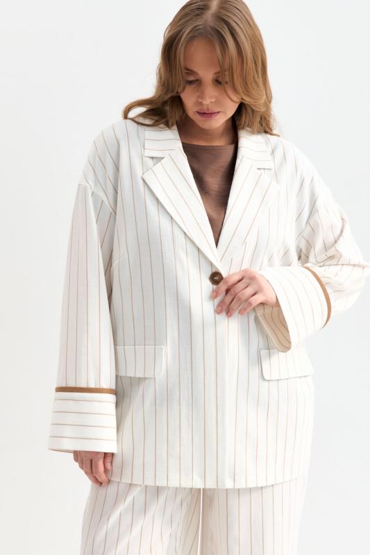 Облегченный жакет в полоску из льняного полотна. Модель свободного силуэта со спущенной линией плеча. Отложной воротник. По переду декоративные клапана. Рукав на широкой манжете, оформленной контрастным кантом.