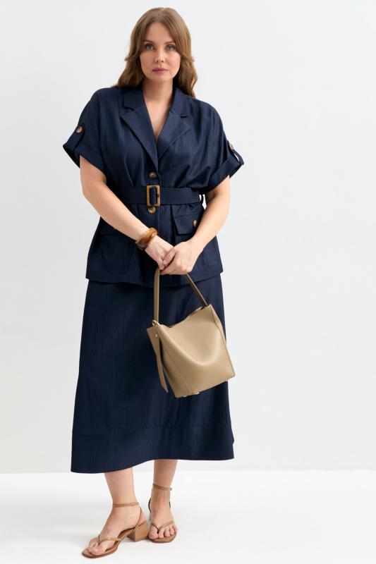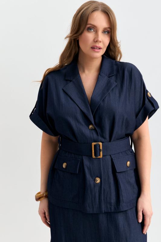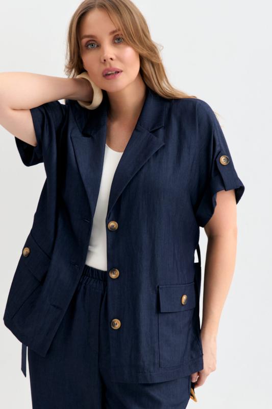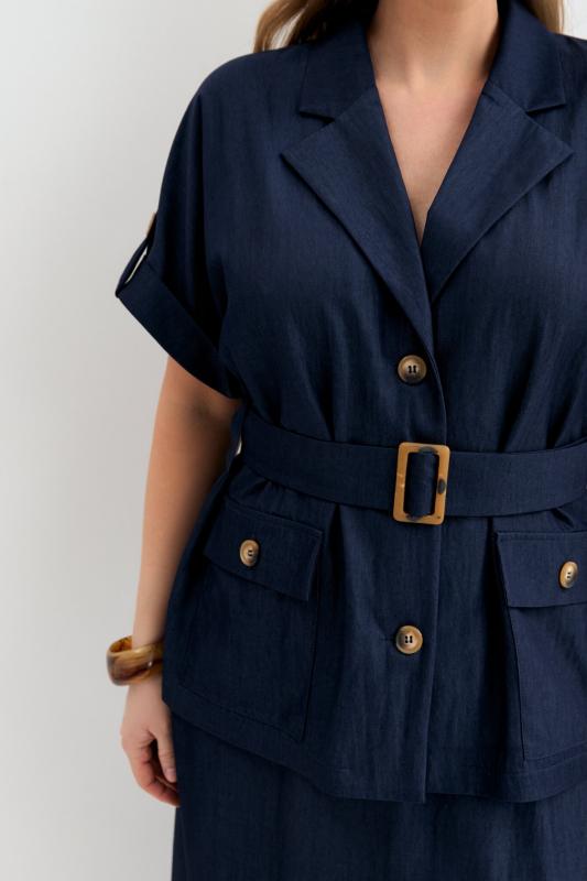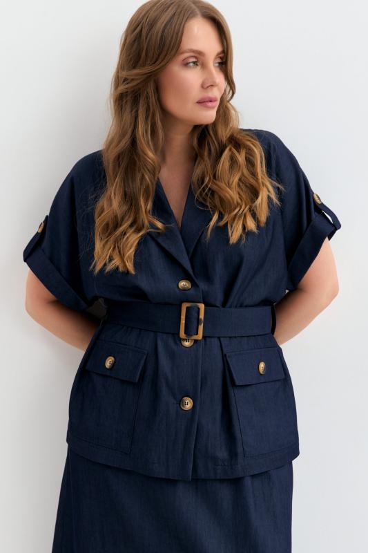 Блуза-рубашка из плотного тенселя с фактурой под джинсу. Модель прямого силуэта. Рукав цельнокроенный, короткий, с манжетой и патой. Отложной воротник. По линии талии шлевки и пояс из основной ткани с пряжкой. Функциональные карманы.