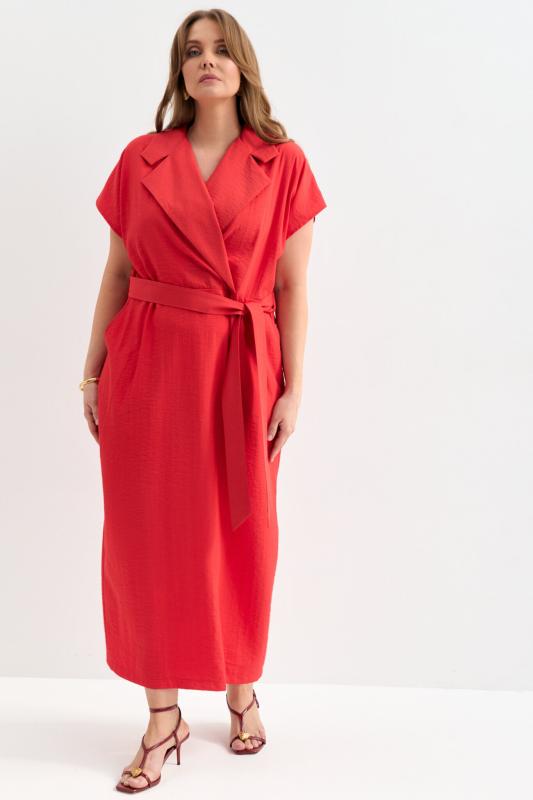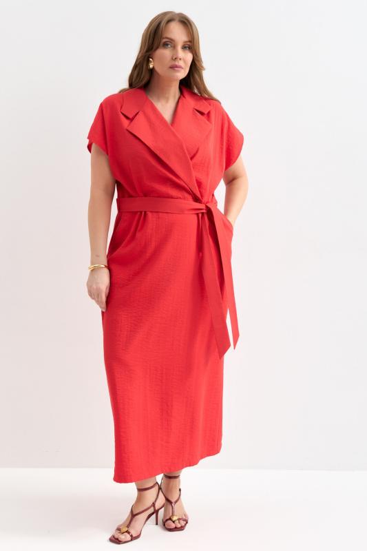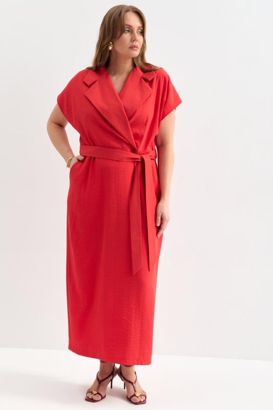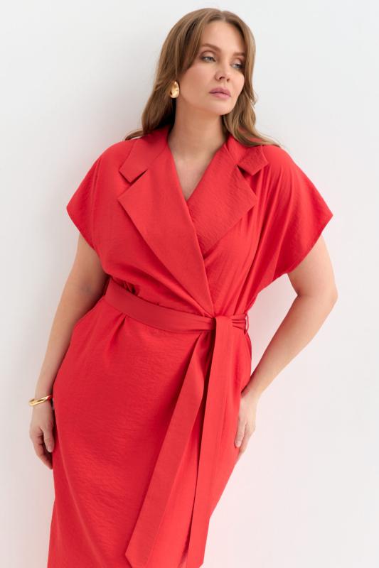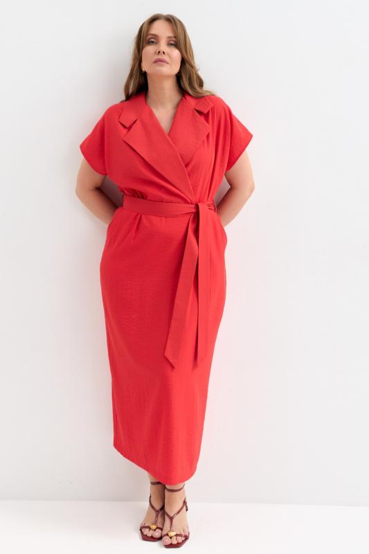 Платье прямого силуэта с акцентным воротником и лацканами. Спущенное плечо, лиф на запах, наклонные карманами по переду. В комплекте пояс.