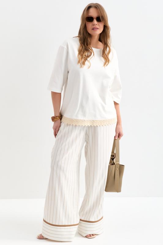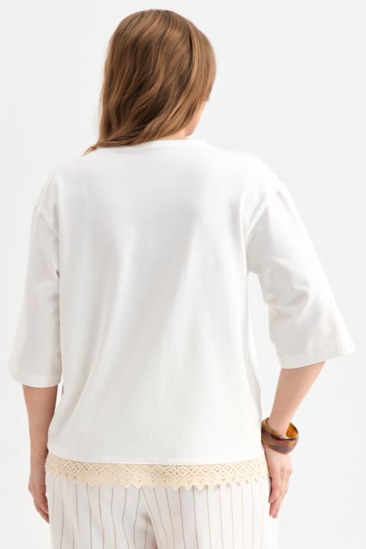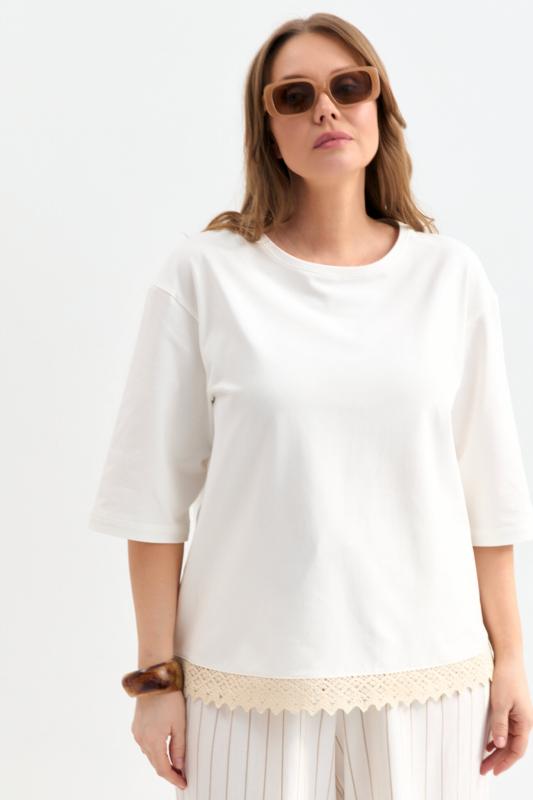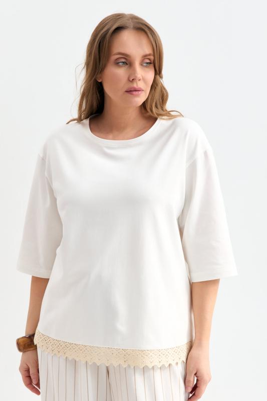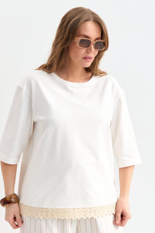 Футболка с удлиненным рукавом и хлопковым кружевом. Модель прямого силуэта. Рукав спущенный до локтя. По низу вставка из хлопкового кружева.
