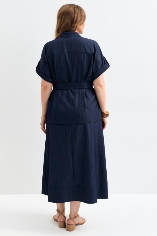 Комфортное лаконичное платье-рубашка из джинсового полотна. Модель полуприлегающая, по переду накладные карманы. Застежка на пуговицу и петли. Рукав втачной прямой. В комплекте пояс из основной ткани.