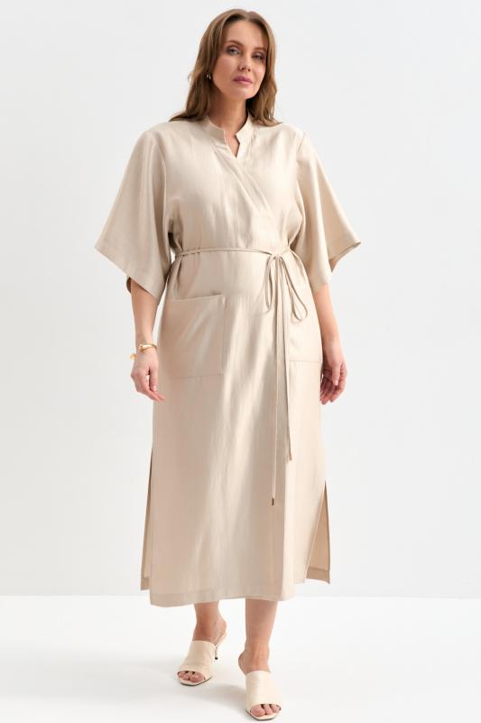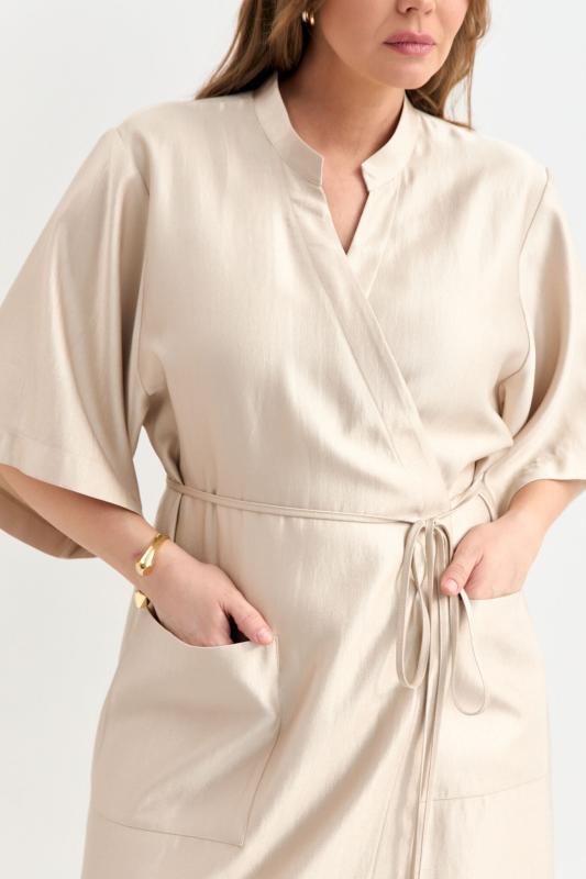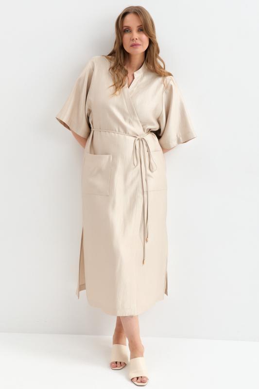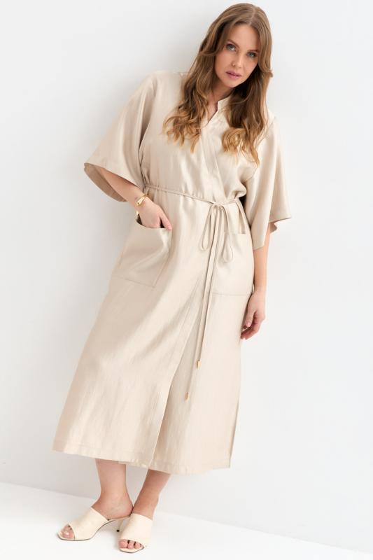Платье-кимоно из вискозы с деликатным сиянием. Модель свободного силуэта на запах. Рукав втачной, широкий. По переду накладные карманы. Воротник стойка. Застежка на внутренний и наружный пояс.