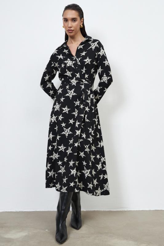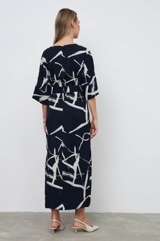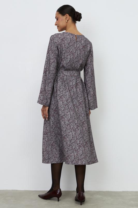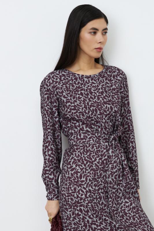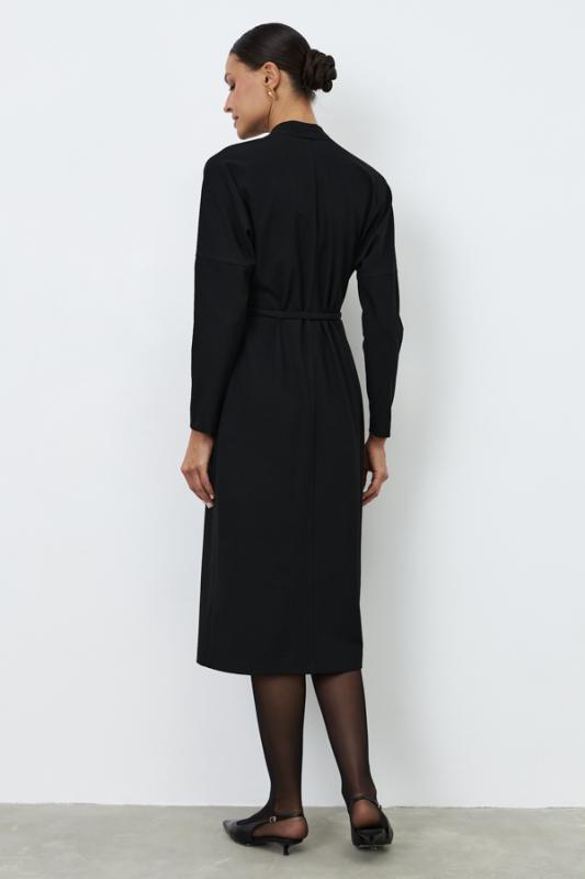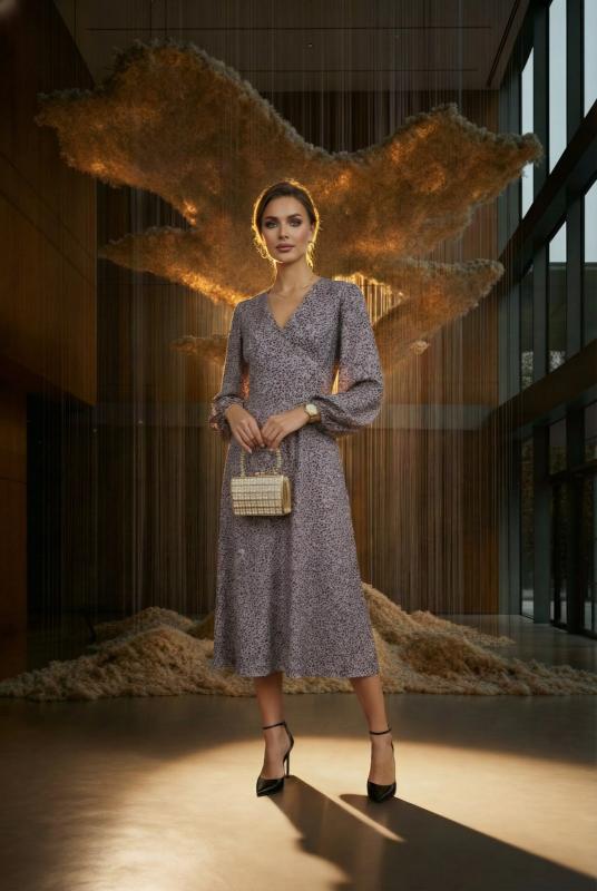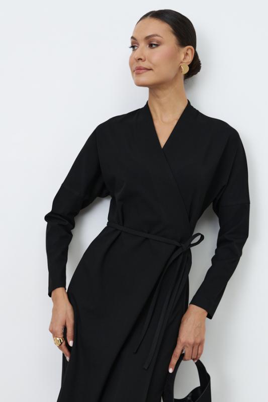 Платье прямого силуэта из плательной ткани. Глубокий V-образный вырез горловины плавно переходит в запах, фиксируется притачным поясом. Втачной длинный рукав в спущенную пройму.