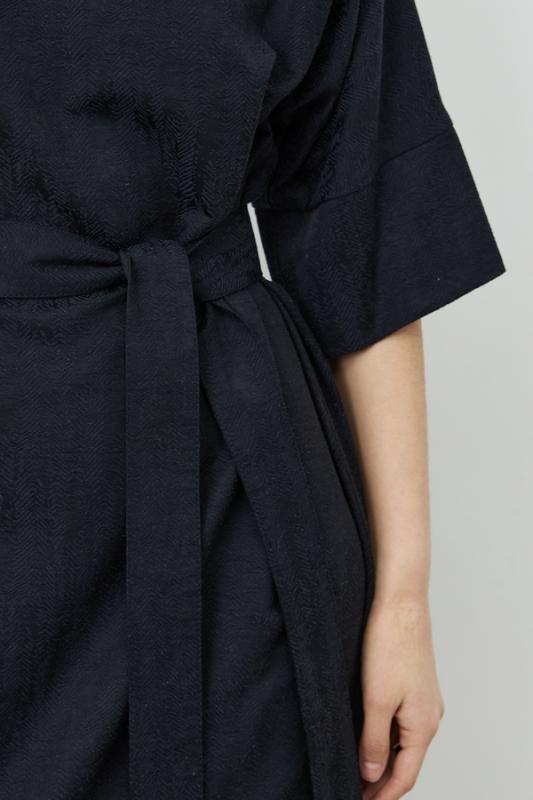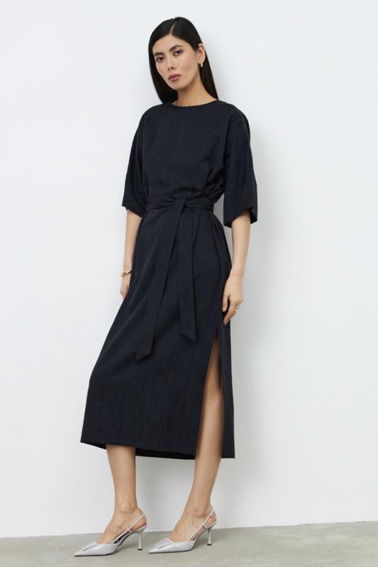 Платье из ткани с крэш-эффектом. Свободный силуэт, с разрезом в боковом шве. Круглый вырез горловины окантован косой бейкой из основной ткани. Цельнокроеный рукав с притачной манжетой. В комплекте пояс из основной ткани. В таблице размеров представлены параметры человека, а не изделия.