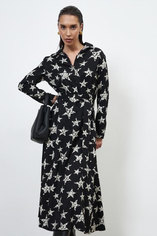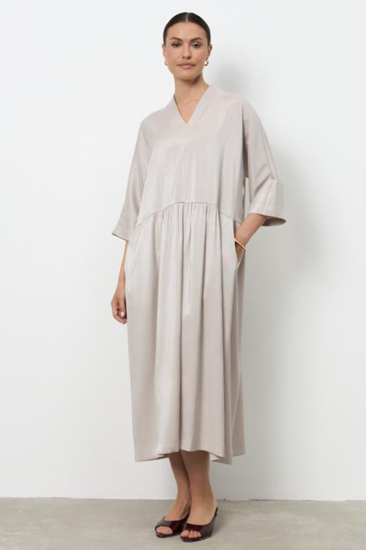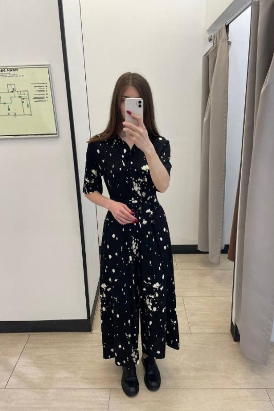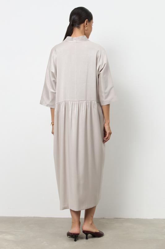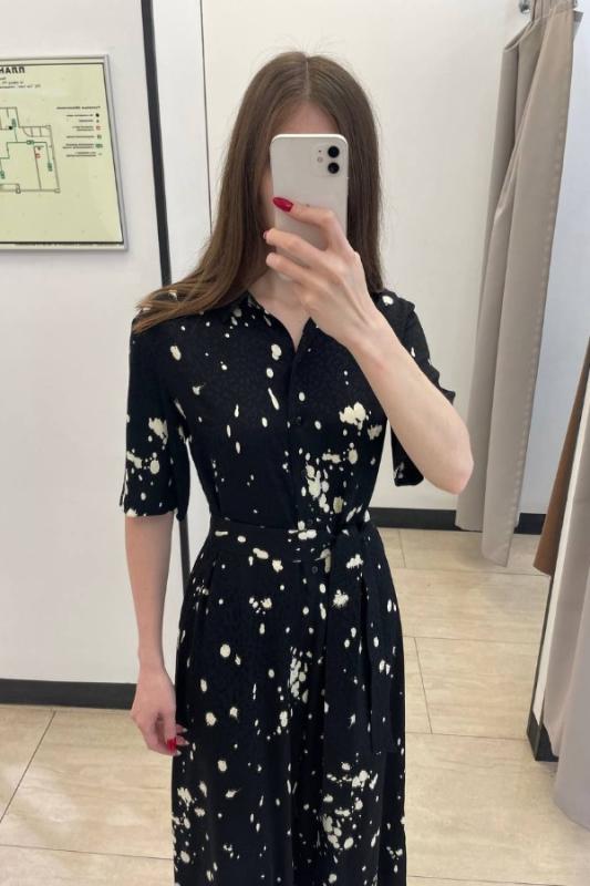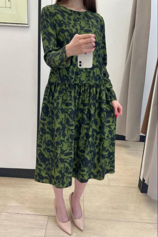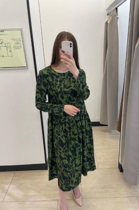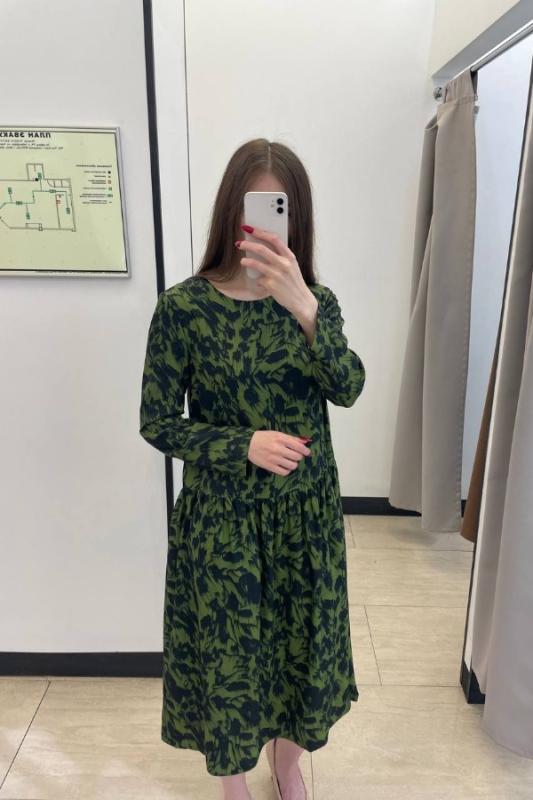 Платье из вискозной ткани очень свободного силуэта. Изделие отрезное чуть ниже линии талии, со сборкой на юбке и подрезными карманами. Цельнокроеная стойка, переходящая в V-образный вырез горловины, визуально делает фигуру стройнее. Длинный цельнокроеный рукав. В таблице размеров представлены параметры человека, а не изделия.