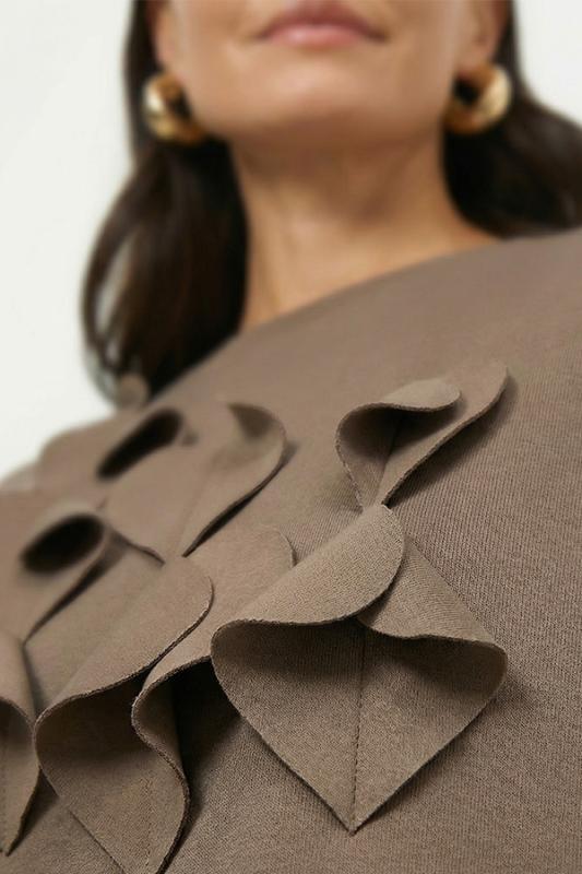 Платье свободного силуэта из ткани с крэш-эффектом, отрезное по линии талии. Нижняя части платья с воланами. Рукав-реглан до локтя. По низу рукава сборка на резину. Линия плеча и линия горловина оформлены сборкой на резину. В комплекте пояс из основной ткани. В таблице размеров представлены параметры человека, а не изделия.
