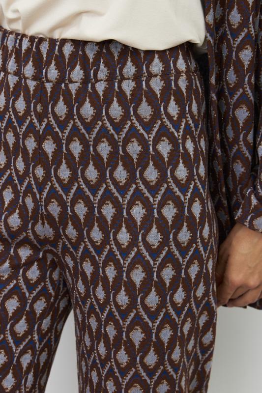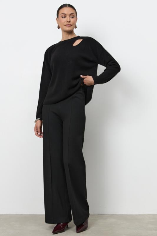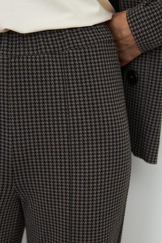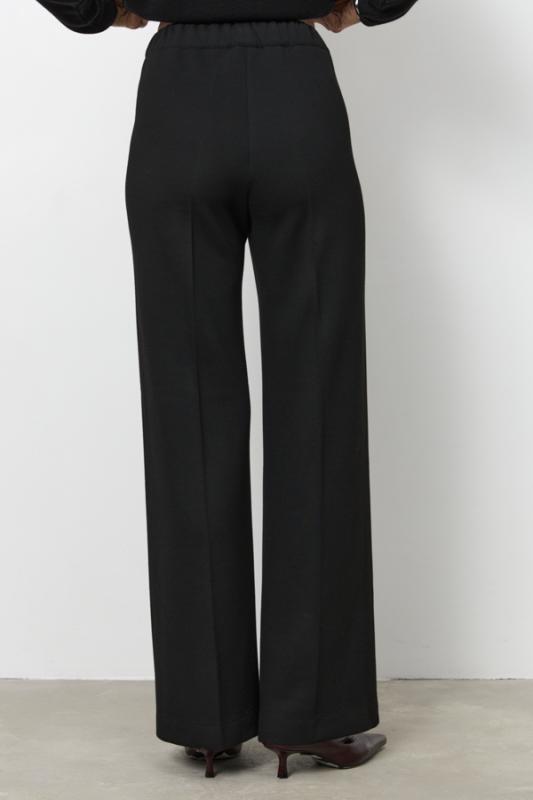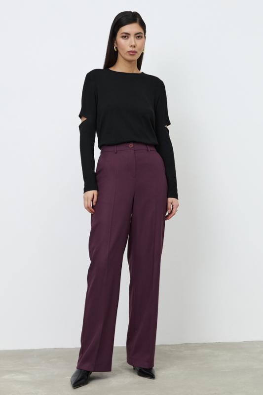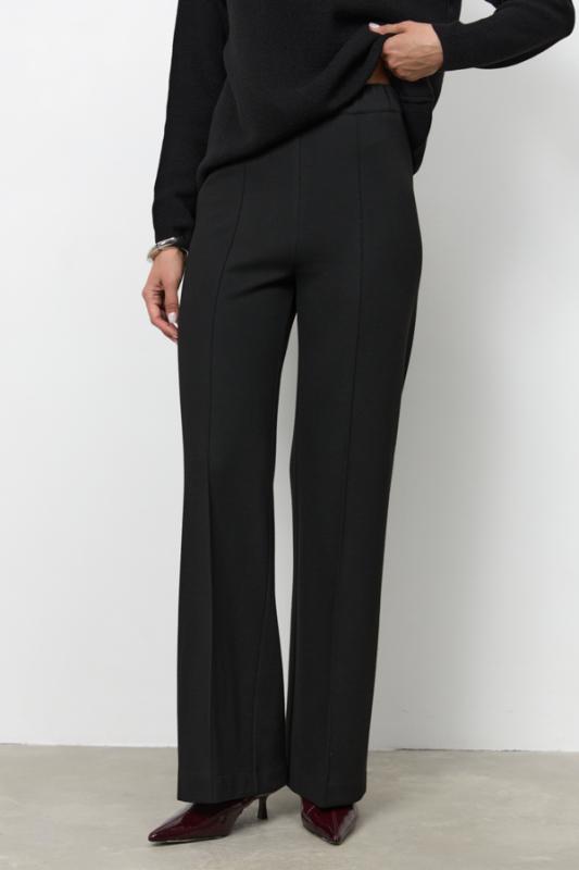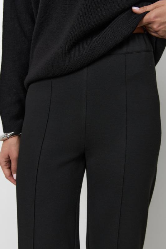 Брюки прямого силуэта из эластичного полотна. Пояс с эластичной резиной. На передней части брюк застрочены стрелки.