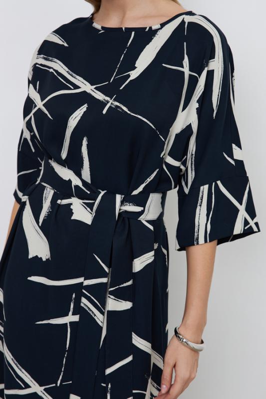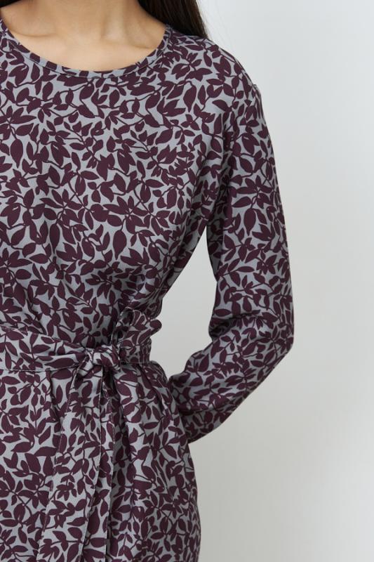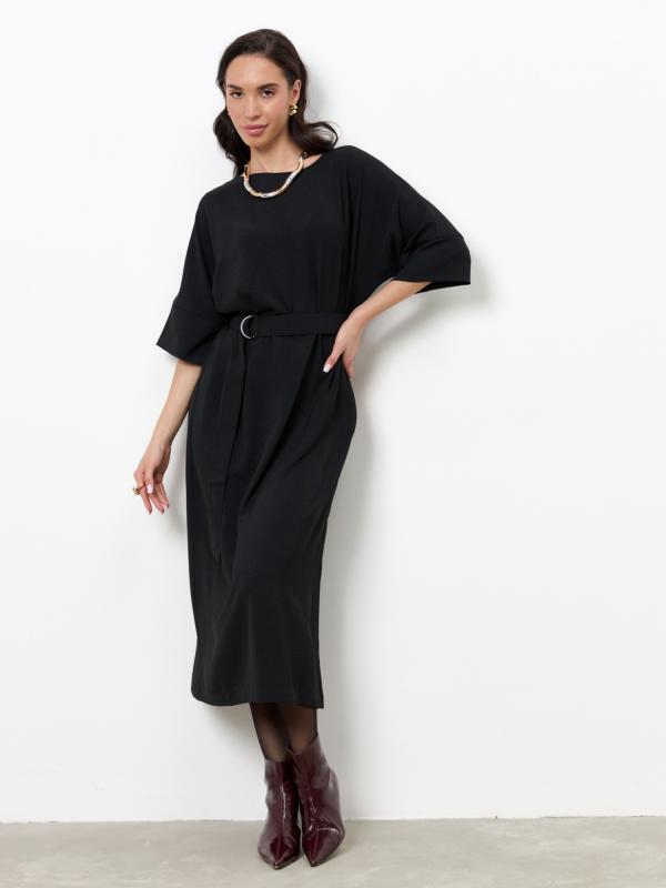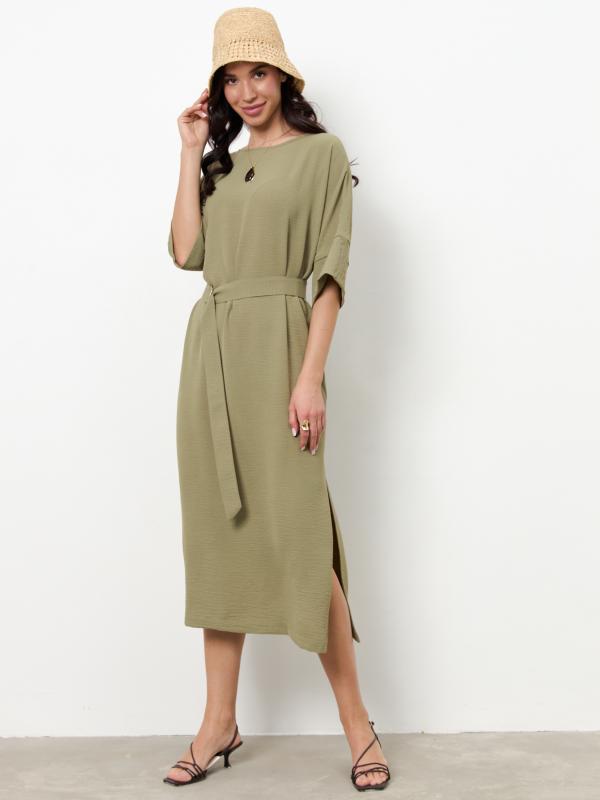 Платье из вискозной ткани. Свободный силуэт, с разрезом в боковом шве. Круглый вырез горловины окантован косой бейкой из основной ткани. Цельнокроеный рукав с притачной манжетой. В комплекте пояс из основной ткани. В таблице размеров представлены параметры человека, а не изделия.