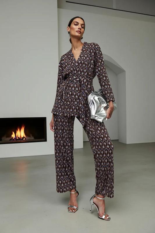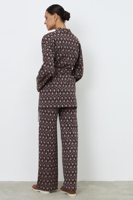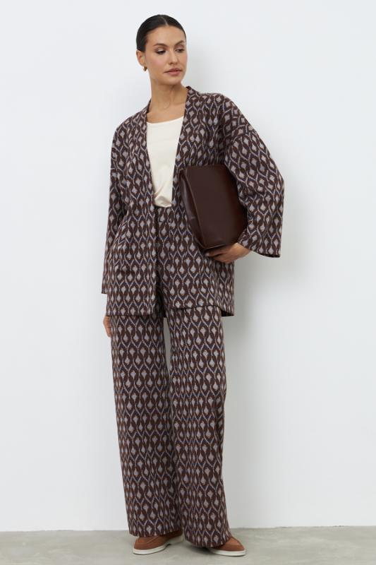 Костюм из эластичного полотна. Брюки прямого силуэта. Пояс с эластичной резиной. Кардиган свободного силуэта с притачной планкой. Втачной широкий рукав в спущенную пройму. В комплекте пояс из основной ткани.