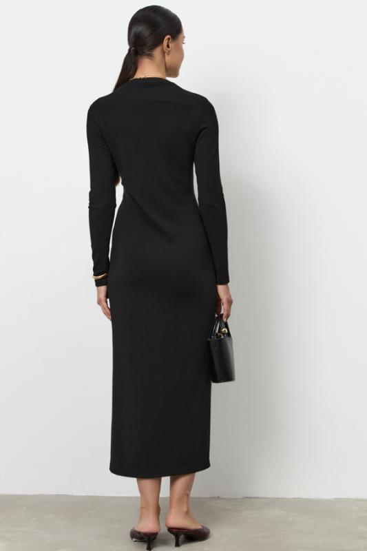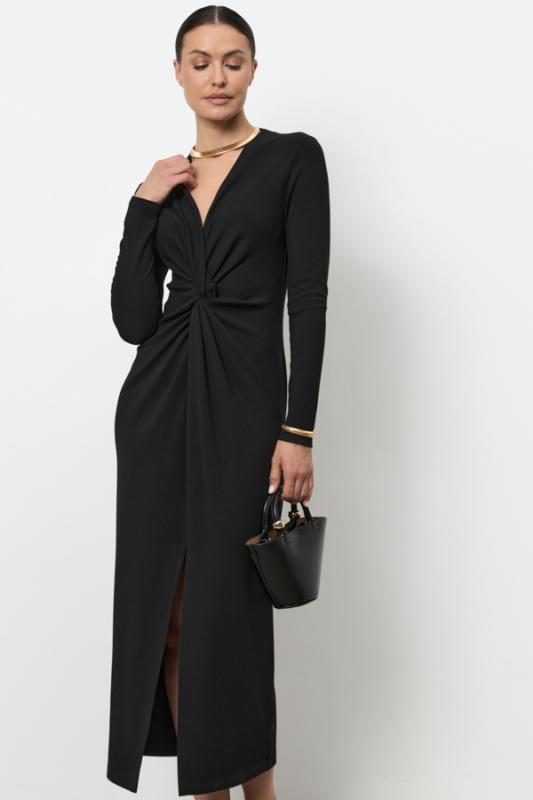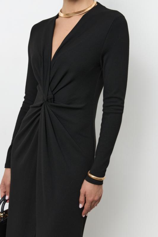 Платье из эластичного полотна прилегающего силуэта. Оригинальный крой с перекрутом на передней части изделия, снизу разрез. Глубокий V-образный вырез горловины. Втачной длинный рукав.