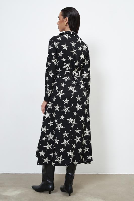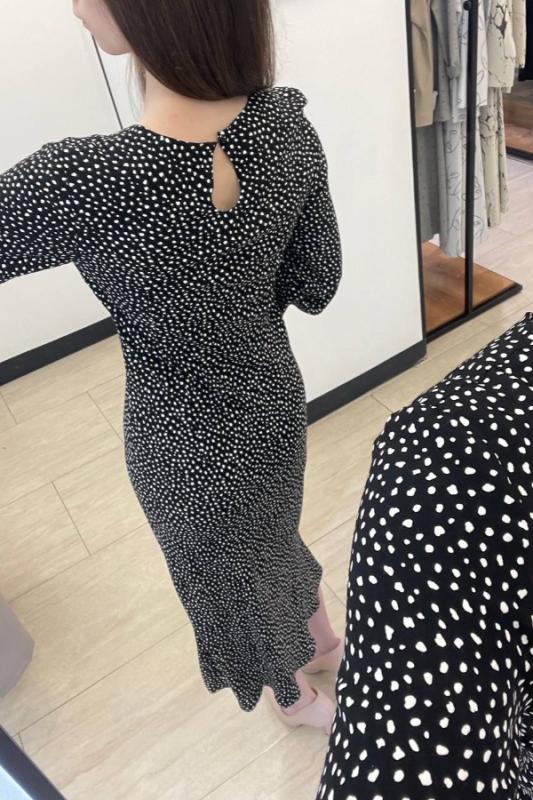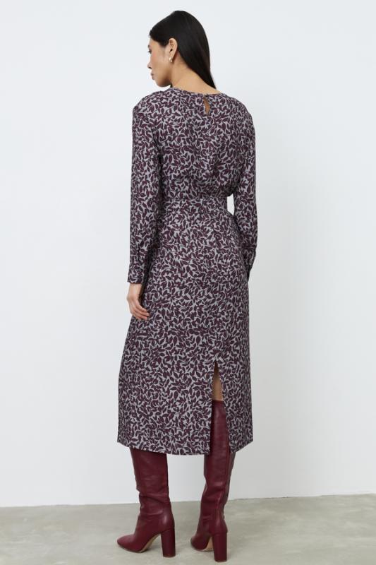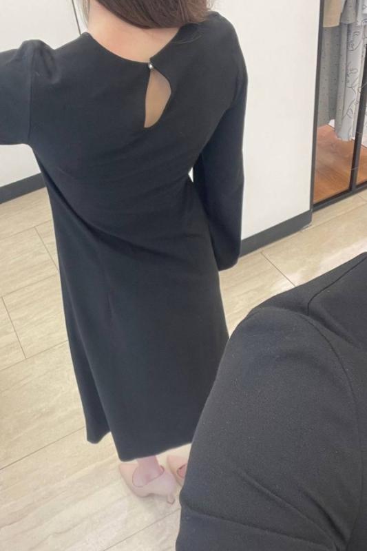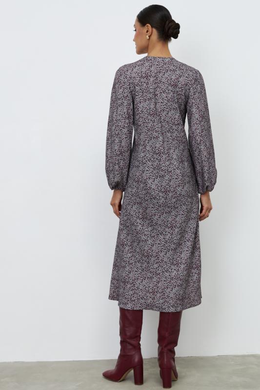 Платье из вискозной ткани прилегающего силуэта. Крой платья по косой. Втачной длинный рукав. Круглый вырез горловины, сзади застёжка на петлю-пуговицу.