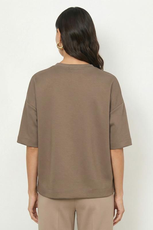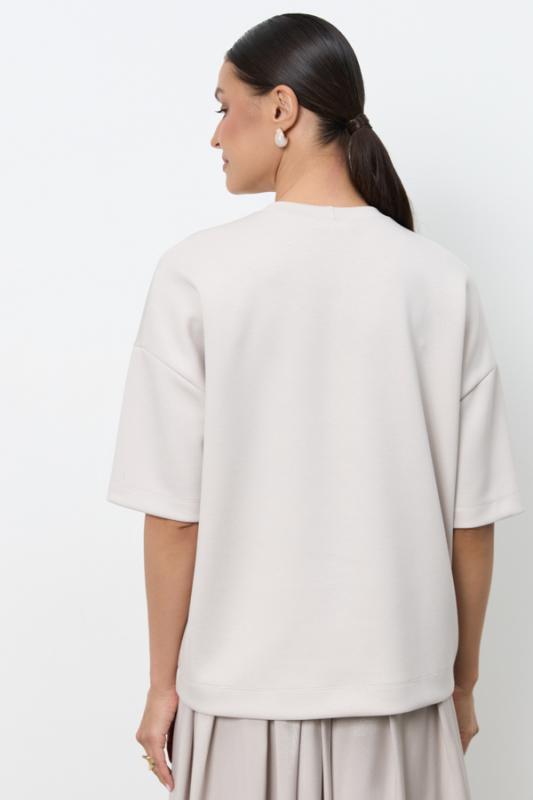 Джемпер свободного силуэта со спущенной линией плеча и рукавом до локтя выполнен из мягкого эластичного полотна. Вырез горловины оформлен бейкой из основной ткани. В таблице размеров представлены параметры человека, а не изделия.
