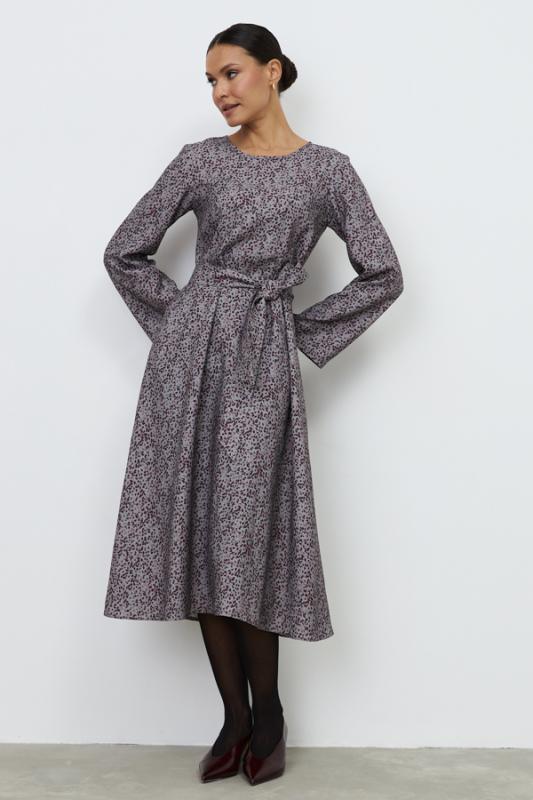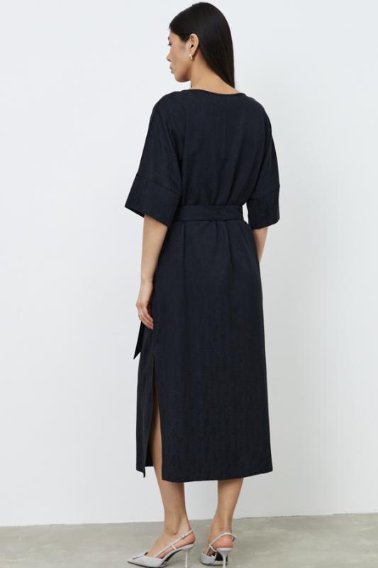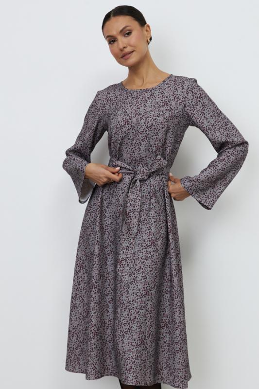 Платье из вискозной ткани полуприлегающего силуэта. Втачной длинный рукав на манжете с застёжкой на пуговицы. На задней части изделия застежка на петлю-пуговицу, снизу выполнен разрез. Круглый вырез горловины оформлен косой бейкой. В комплекте пояс из основной ткани.