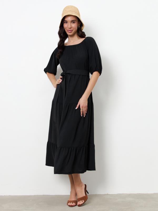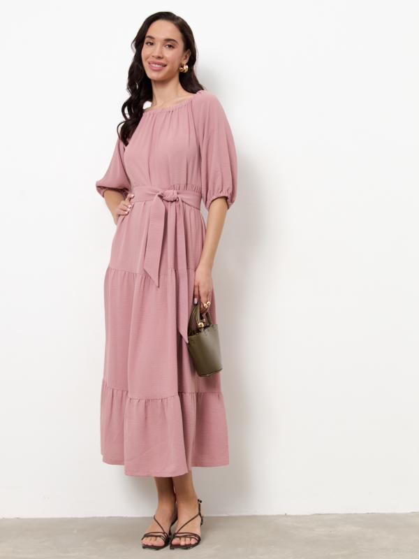 Платье из вискозной плательной ткани. Полуприлегающий силуэт, с разрезом в боковом шве. Круглый вырез горловины. По среднему шву спинки застёжка на петлю-пуговицу.