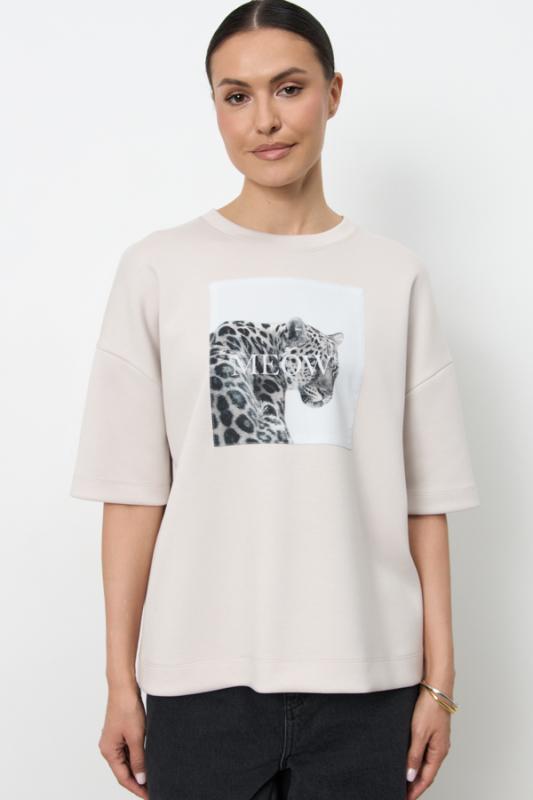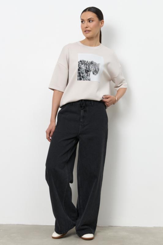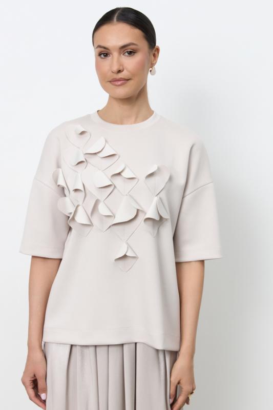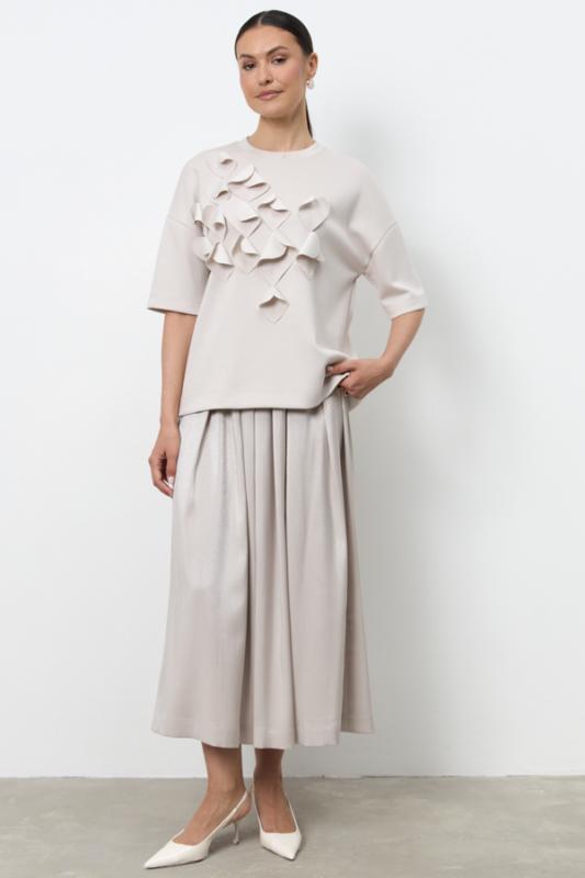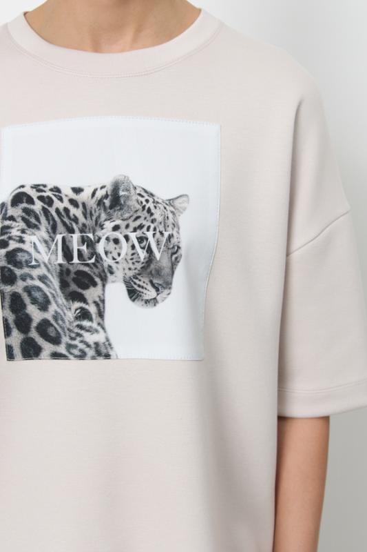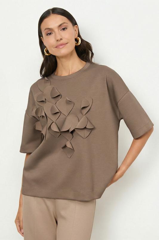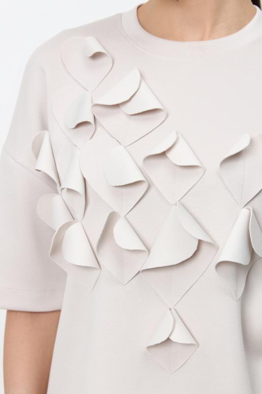 Джемпер свободного силуэта со спущенной линией плеча и рукавом до локтя выполнен из эластичного полотна. Вырез горловины оформлен бейкой из основной ткани. На передней части изделия выполнена аппликация. В таблице размеров представлены параметры человека, а не изделия.
