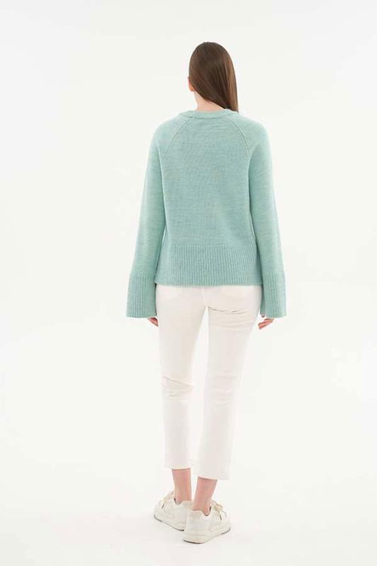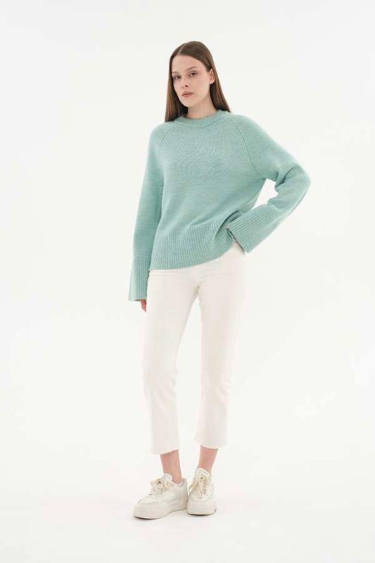 Джемпер свободного силуэта. Длинный рукав-реглан, чуть расширенный книзу. Круглый вырез горловины оформлен резинкой, низ изделия и низ рукава-высокой резинкой. Изделие выполнено из мягкой меланжевой пряжи.