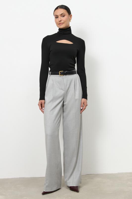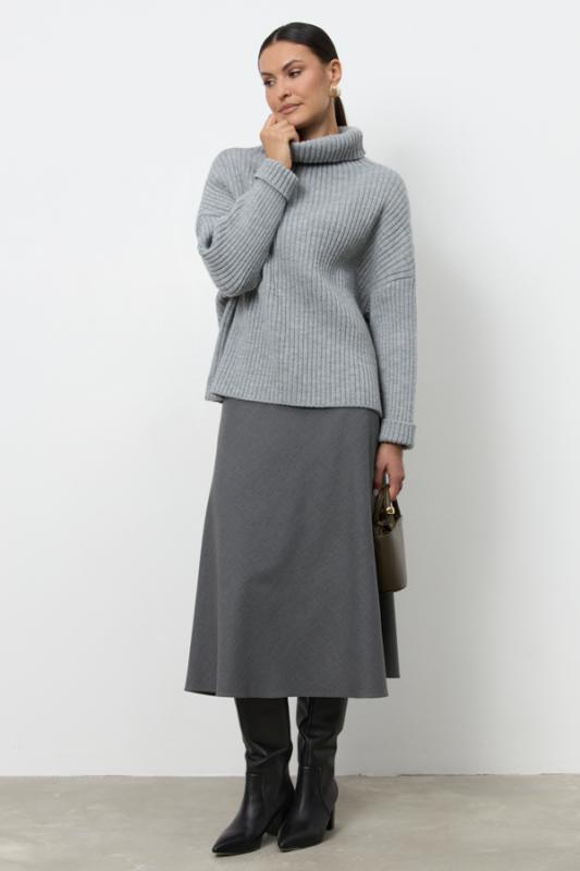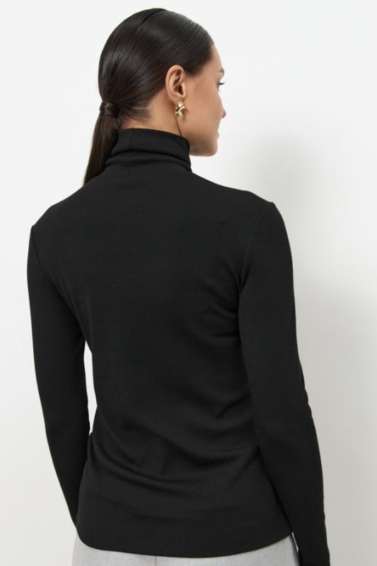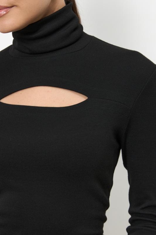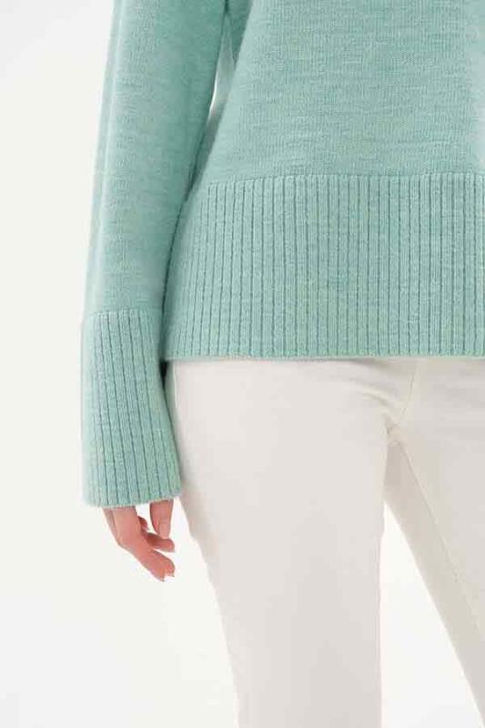 Джемпер из эластичного полотна в мелкий рубчик прилегающего силуэта. На передней части изделия выполнен эффектный разрез. Втачной длинный рукав. Вырез горловины оформлен высокой стойкой.