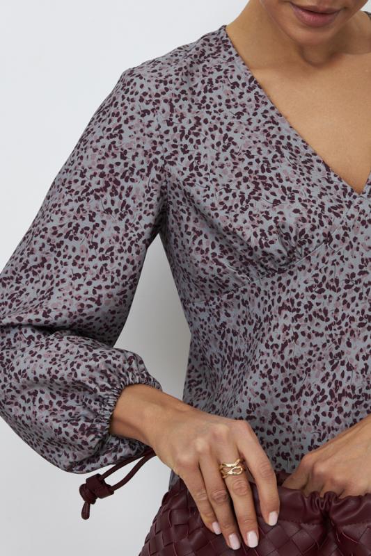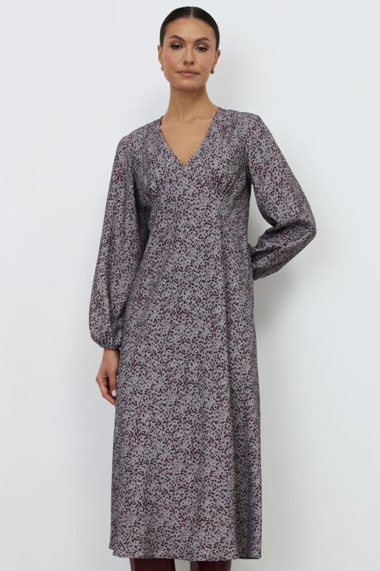 Платье из вискозной ткани полуприлегающего силуэта, расширенное книзу. Крой платья-по косой. На передней части изделия выполнен фигурный подрез в области груди, со сборкой. V-образный вырез горловины оформлен косой бейкой. Втачной длинный рукав, по низу рукава сборка на резину.