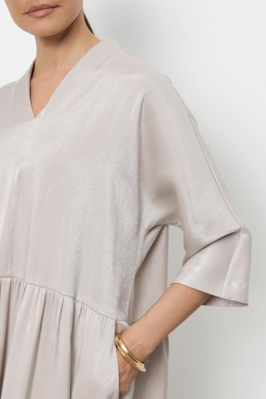 Платье свободного силуэта из плательной ткани. По центру передней части изделия выполнен шов. Цельнокроеная стойка, переходящая в V-образный вырез горловины, визуально делает фигуру стройнее. Втачной короткий рукав.
