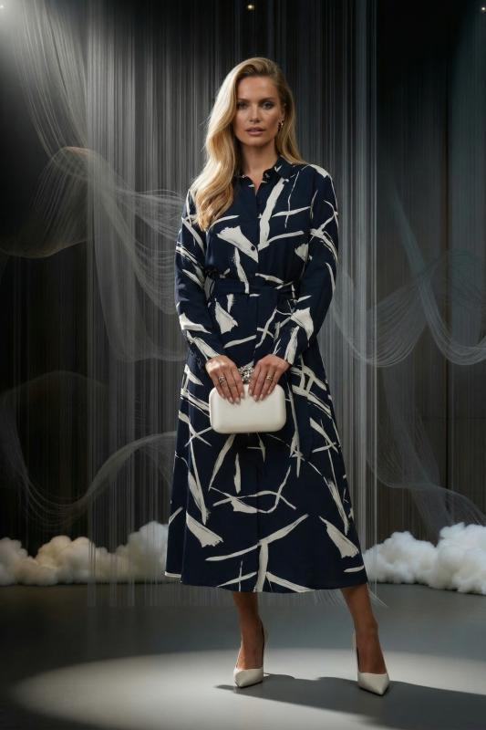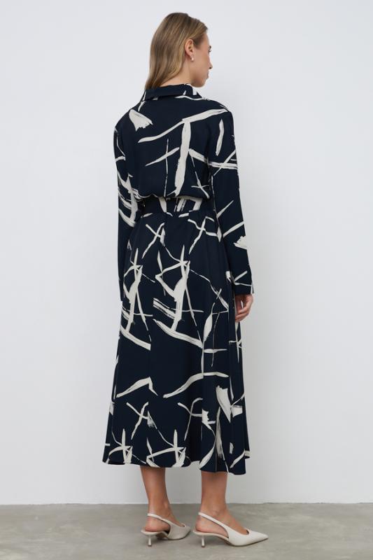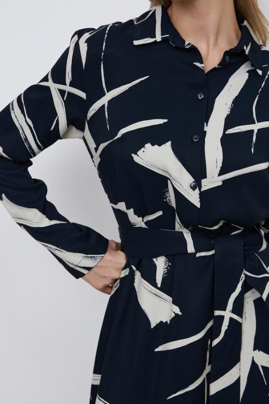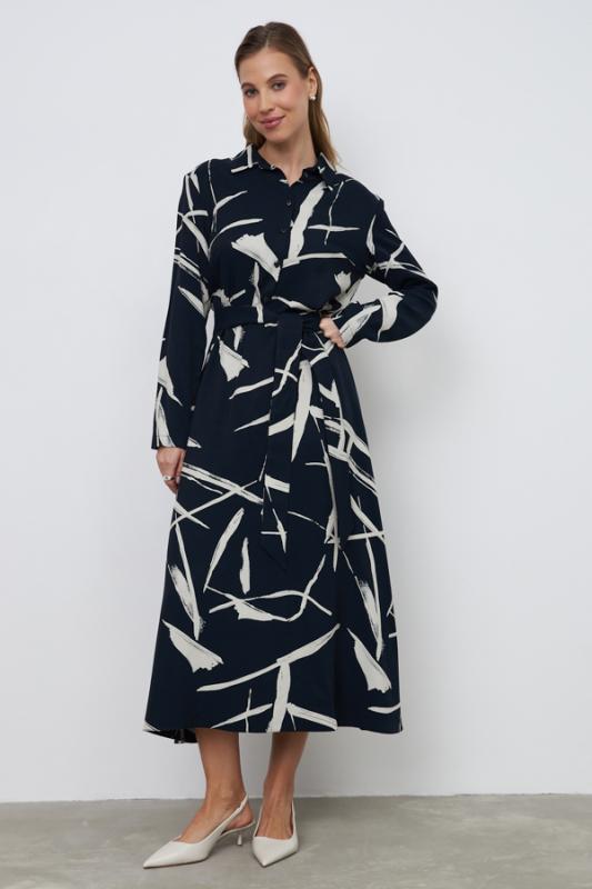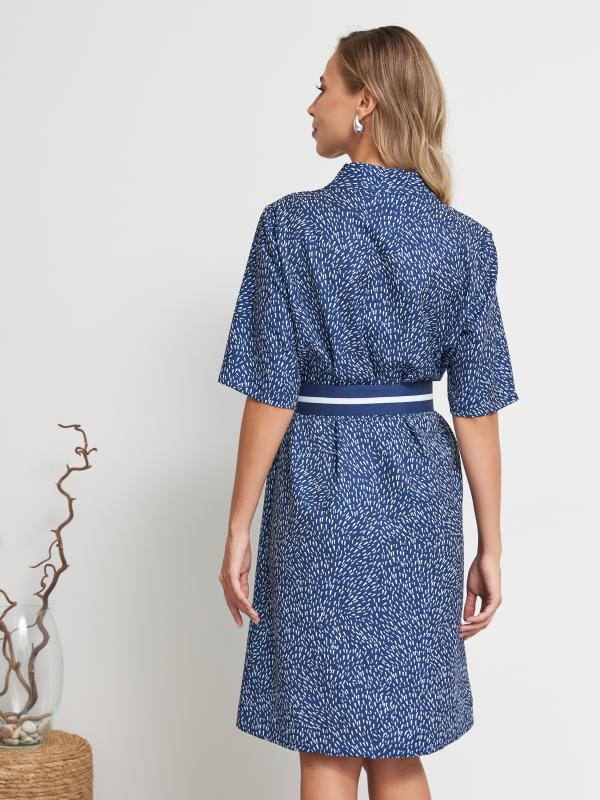 Платье из вискозной ткани полуприлегающее в области груди и свободное в области бедер. Изделие отрезное по линии талии. Лиф с застёжкой на пуговицы. Вырез горловины обработан отложным воротником на стойке. Втачной длинный рукав. В комплекте пояс из основной ткани.
