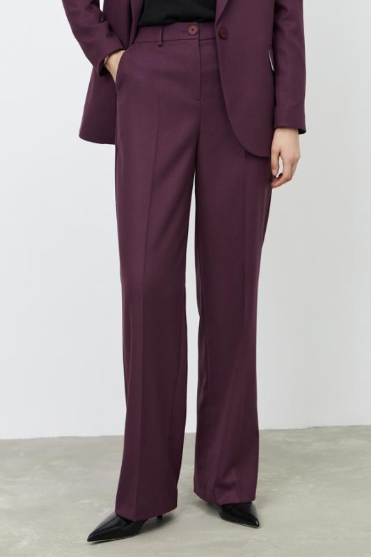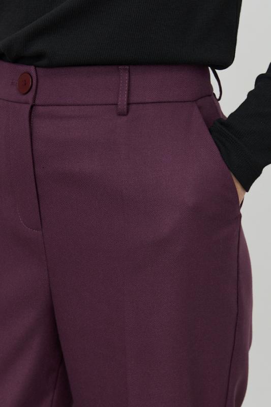Брюки из костюмной ткани прямого силуэта. На передней половинке изделия выполнены карманы с подкройным бочком, на задней - талиевые вытачки и имитация карманов в рамку. Притачной пояс со шлёвками, сзади - вставка с резинкой. Застёжка на молнию-гульфик и пуговицу. Такой крой выгодно подчеркнёт длину ваших ног.