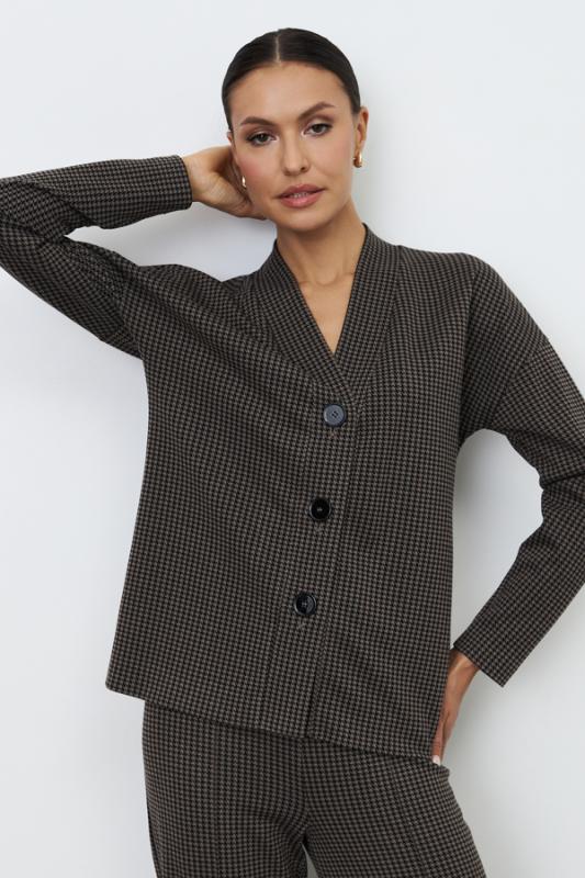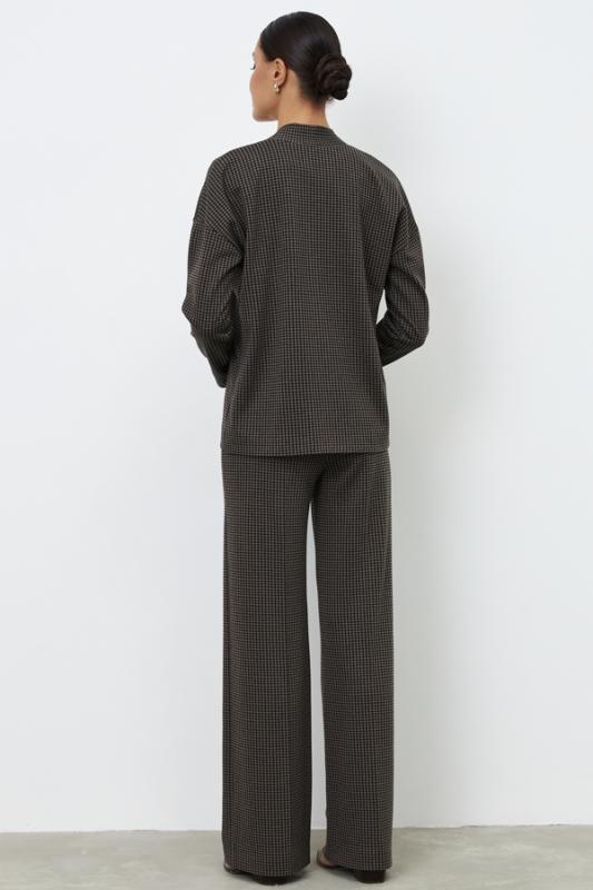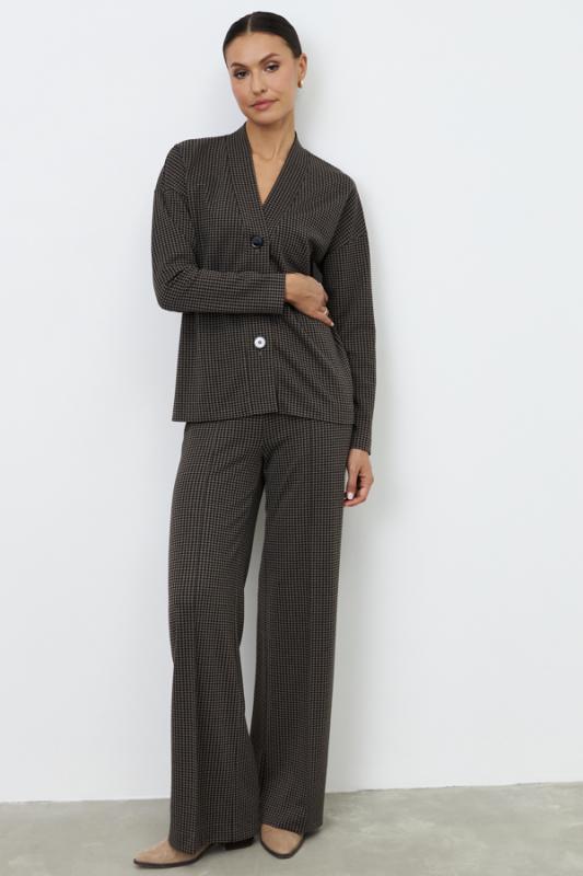 Костюм выполнен из эластичного полотна. Брюки прямого силуэта. На передней части брюк застрочены стрелки. Пояс с эластичной резиной. Кардиган свободного силуэта с притачной планкой и застёжкой на пуговицы. Втачной длинный рукав в спущенную пройму.