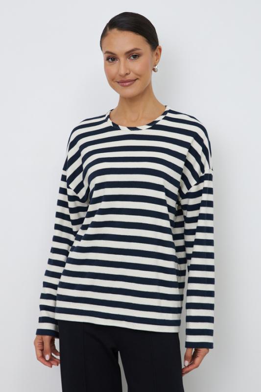 Джемпер из эластичного полотна. Свободный силуэт со спущенной линией плеча и длинным рукавом. Вырез горловины окантован эластичной бейкой. В таблице размеров представлены параметры человека, а не изделия.