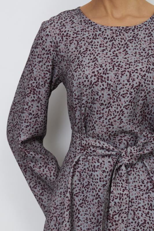 Платье свободного силуэта из плательной ткани. По центру передней части изделия выполнен шов. Цельнокроеная стойка, переходящая в V-образный вырез горловины, визуально делает фигуру стройнее. Втачной длинный рукав с центральным швом и декоративным разрезом по низу рукава. В комплекте пояс из основной ткани.