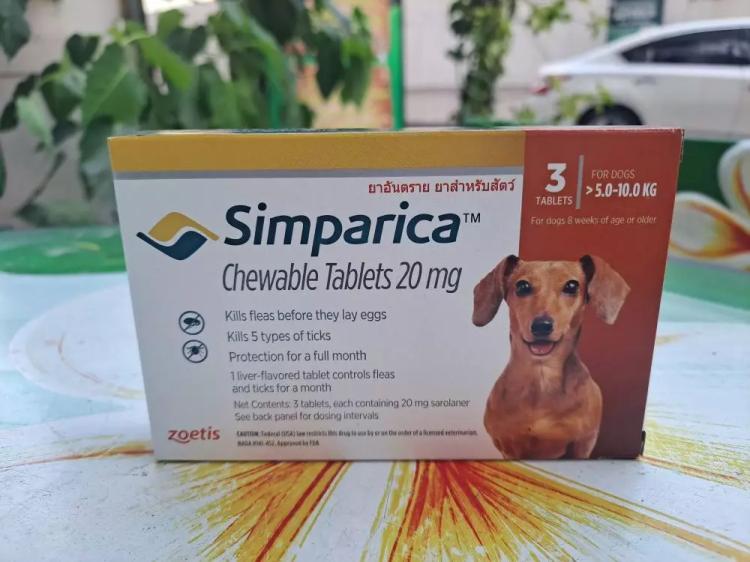Таблетки симпарика содержат 20 мг сароланера, что подходит для небольших собак от 5 до 10 кг.