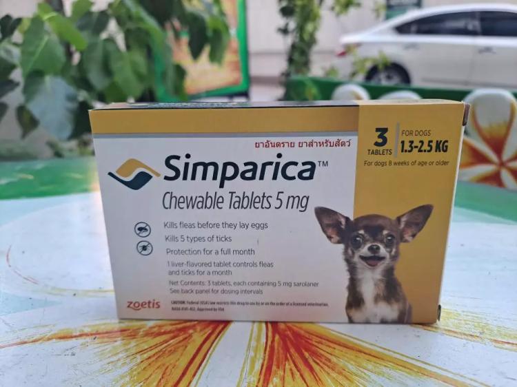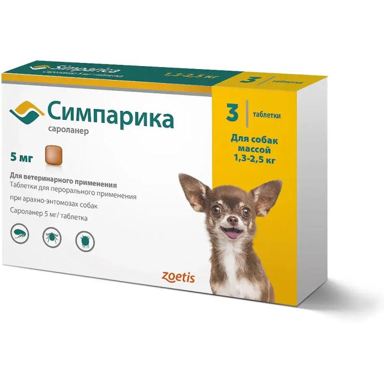Таблетки симпарика содержат 5 мг сароланера, что подходит для небольших собак от 1,3 до 2,5 кг.