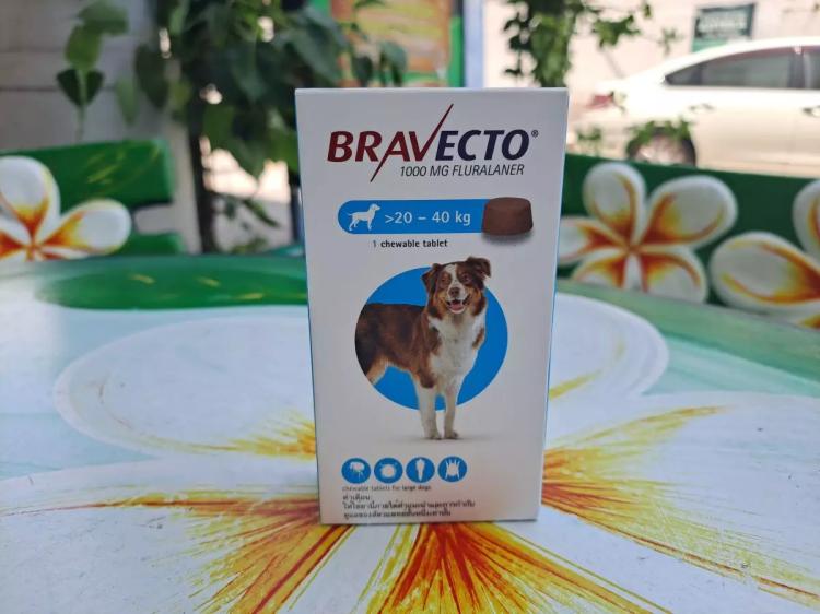 Дозировка таблеток Бравекто в картонной коробке с синим кружочком рассчитана на собак весом 20-40 кг. Это 1000 мг действующег