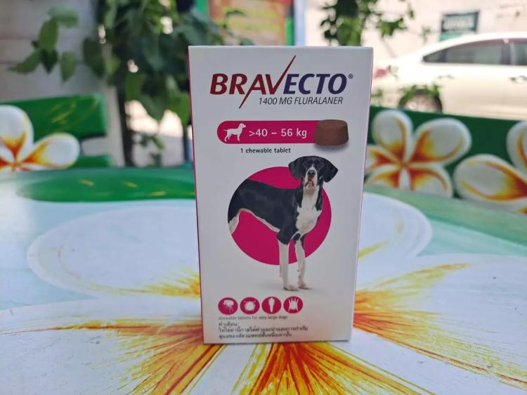 Дозировка таблеток Бравекто в картонной коробке с малиновым кружочком рассчитана на собак весом 40-56 кг. Это 1400 мг действу