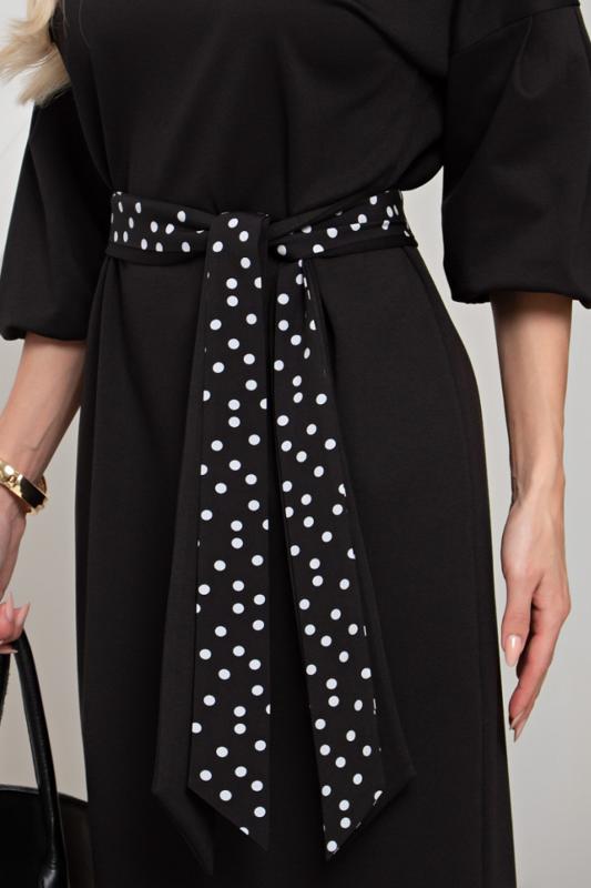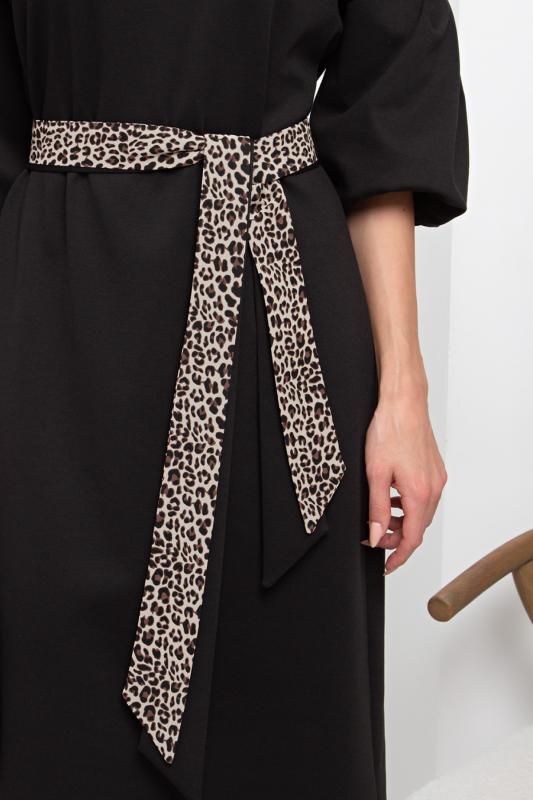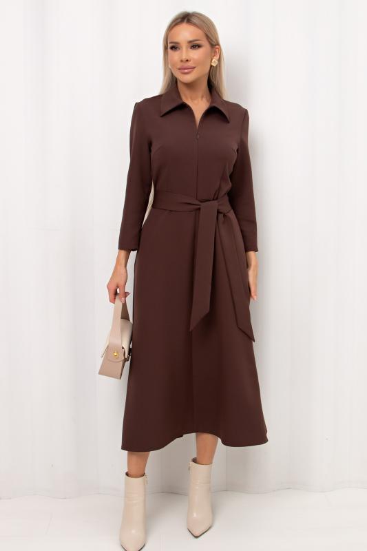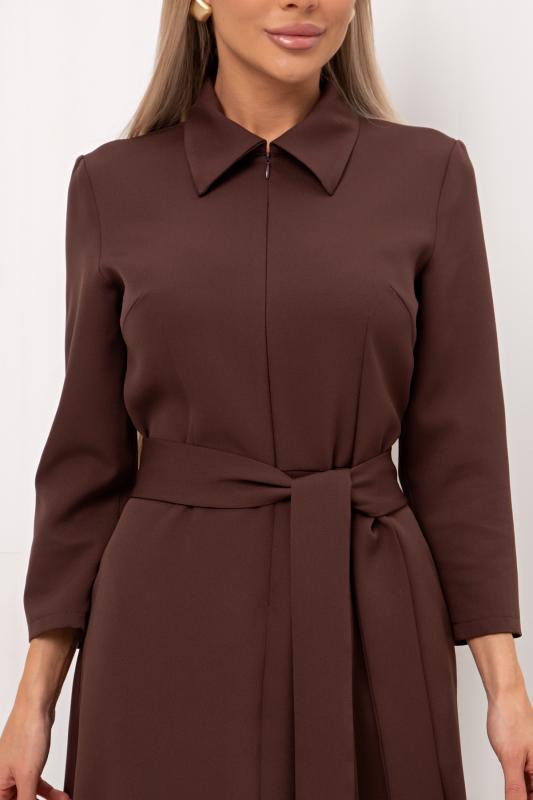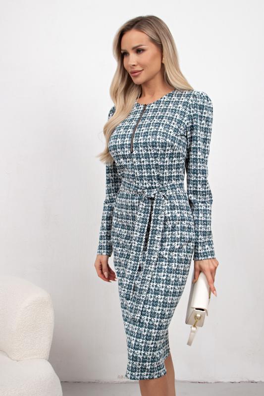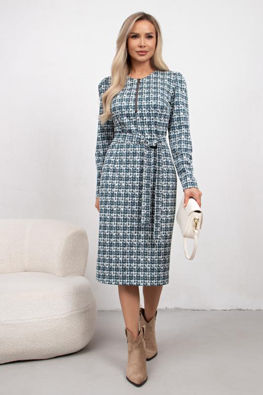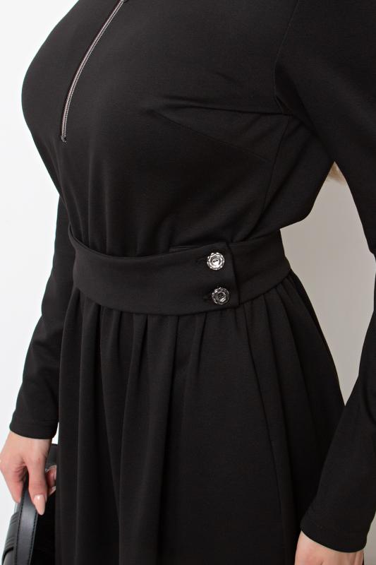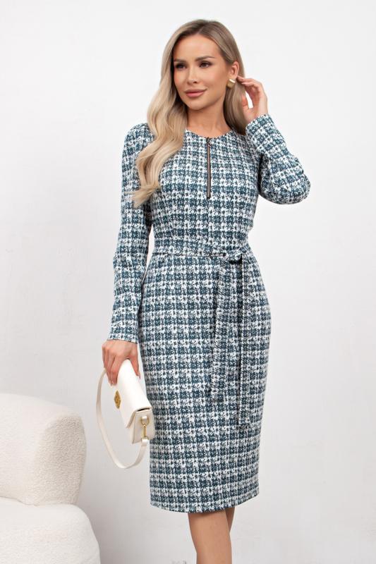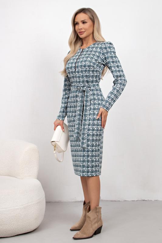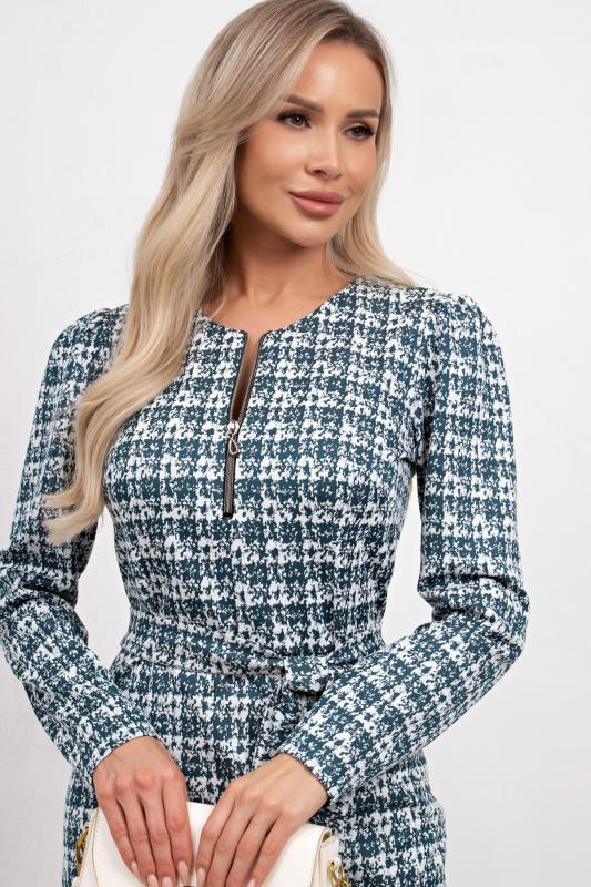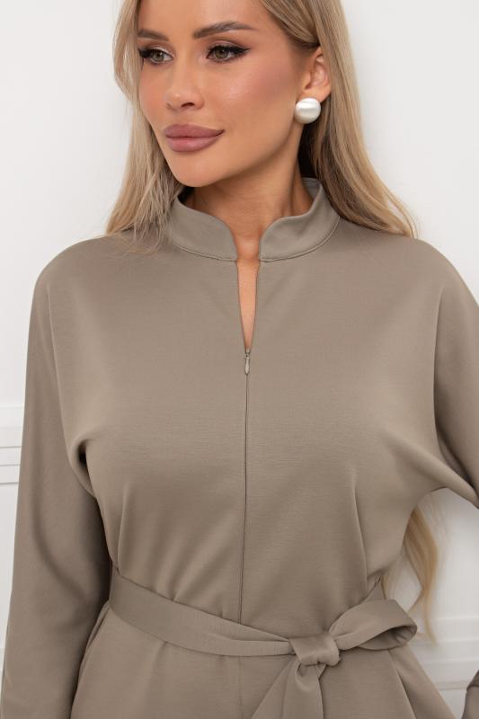 Платье полуприлегающего силуэта из трикотажного полотна. Округлая горловина на внутренней обтачке, по переду расположена застежка на молнию. Длинный втачной рукав. Низ ровный, сзади разрез. Пояс из основного материала в комплекте.
