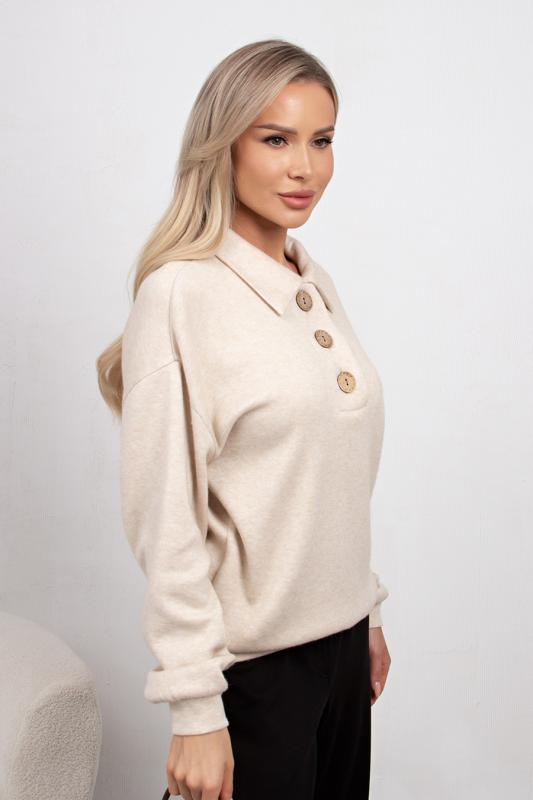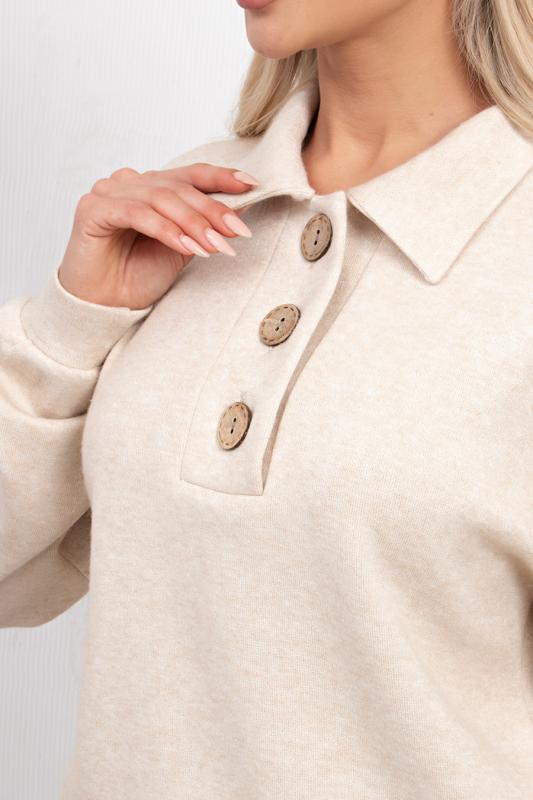 Комфортный джемпер свободного кроя из трикотажного полотна. Длинный втачной рукав со спущенным плечом присобран на манжету. Отложной воротник. Перед оформлен планкой с застежкой на петли и пуговицы. Низ на манжете.