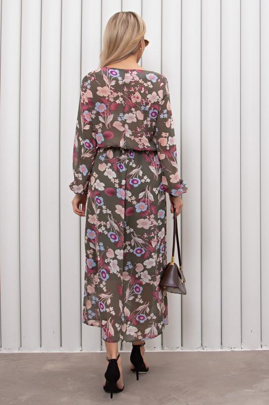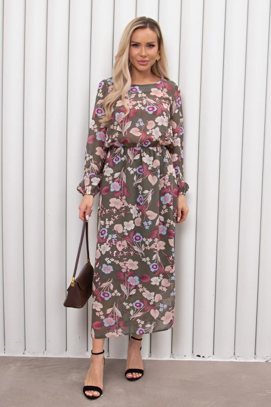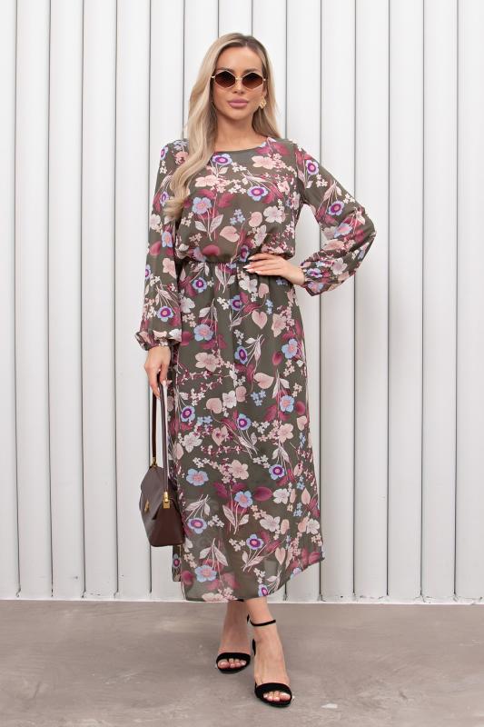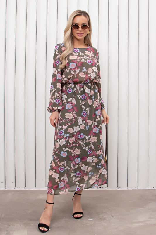 Женственное платье приталенного силуэта выполнено из креп-шифона. Округлая горловина на внутренней обтачке. Длинный втачной рукав присобран на эластичную резинку. Модель отрезная по линии талии, присобрана на резинку. Юбка на подкладке. Низ ровный, без разрезов.