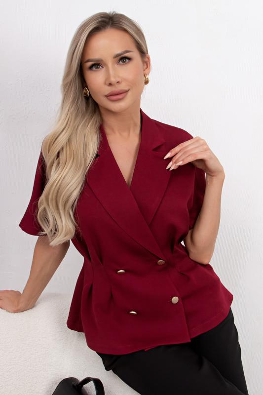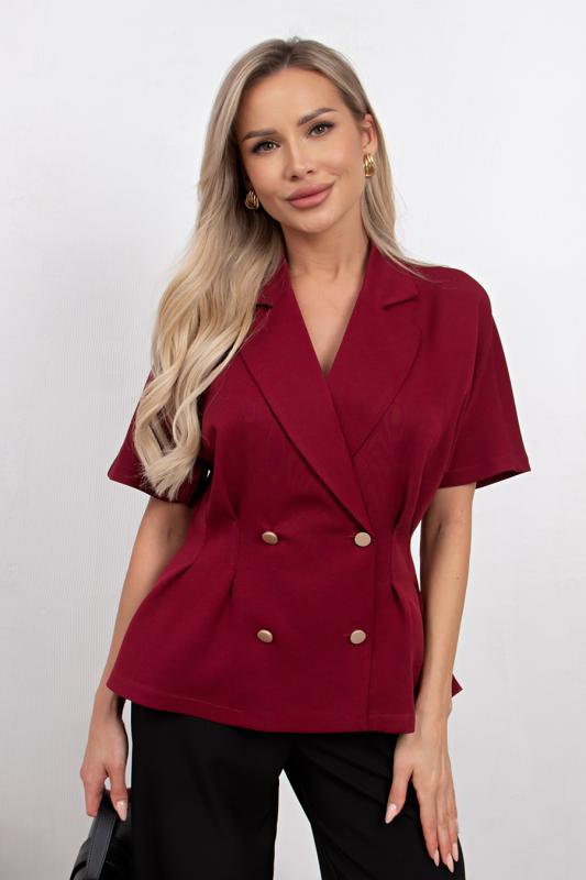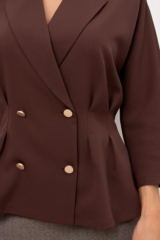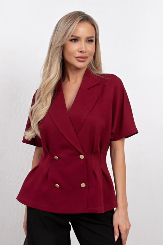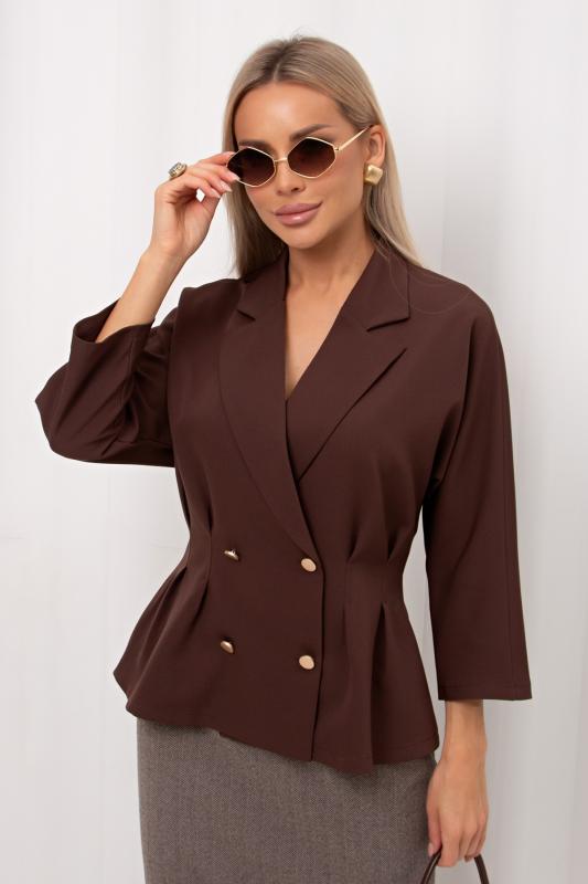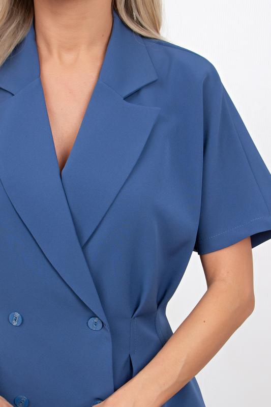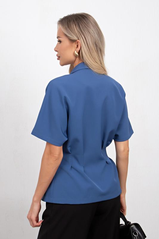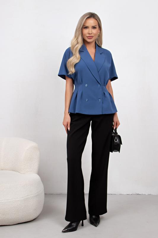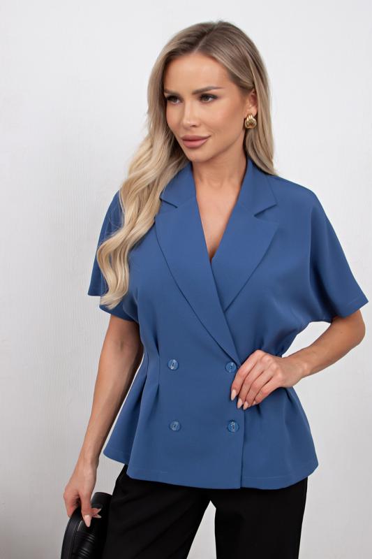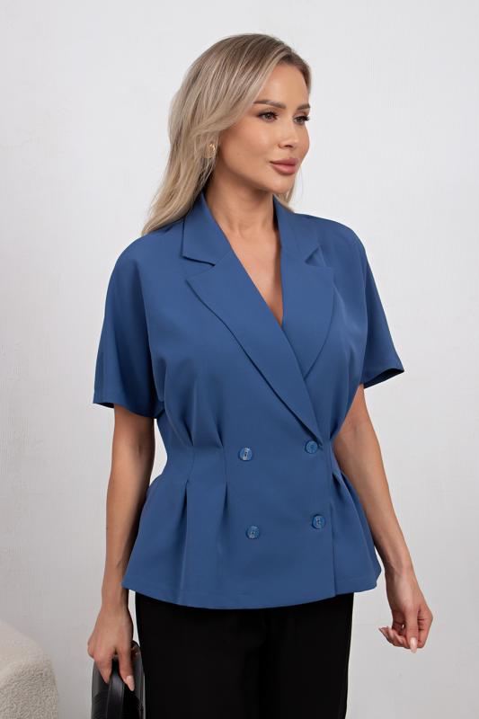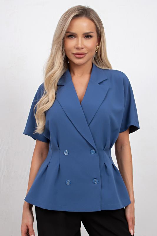 Комфортный летний жакет приталенного силуэта выполнен из легкой костюмной ткани. Цельнокроенный короткий рукав. Английский отложной воротник. Двубортная застежка на петли и пуговицы. По линии талии застрочены складки. Низ ровный, без разрезов.