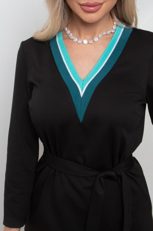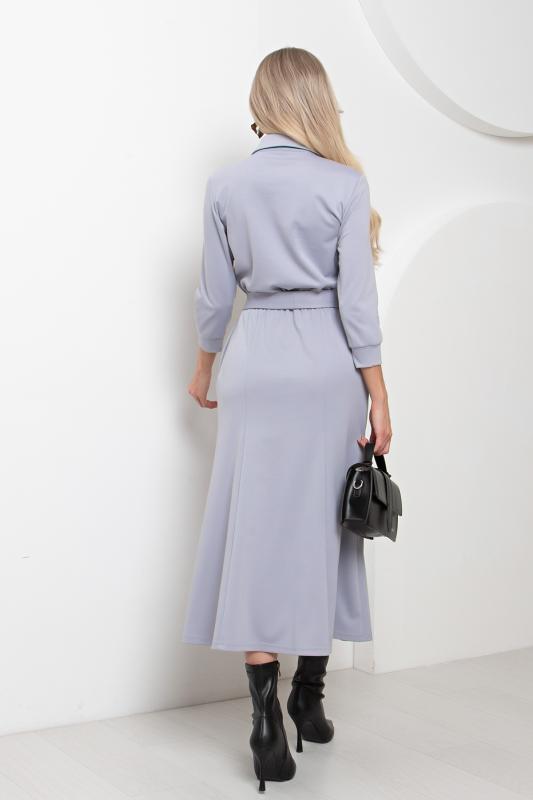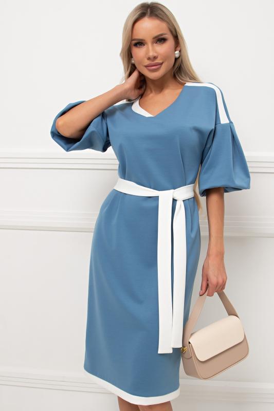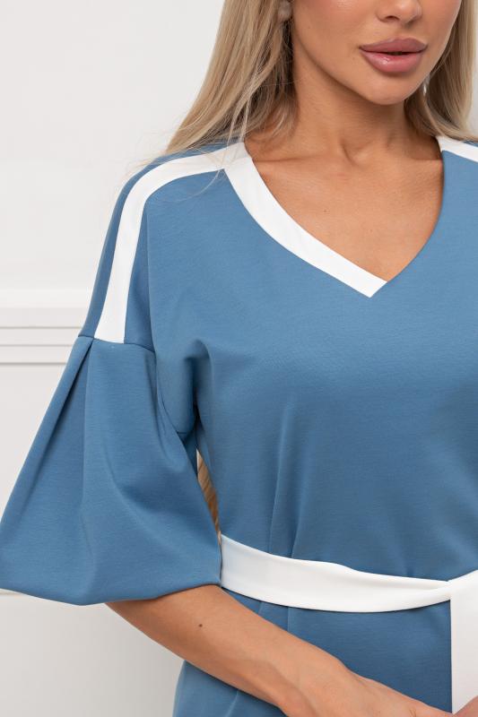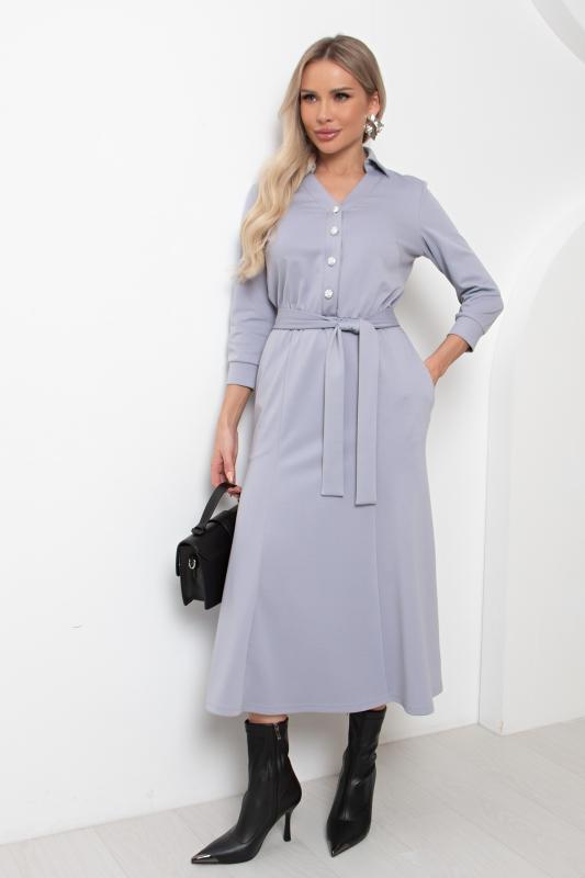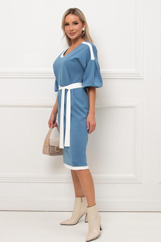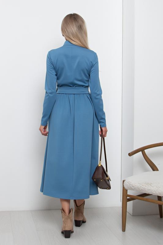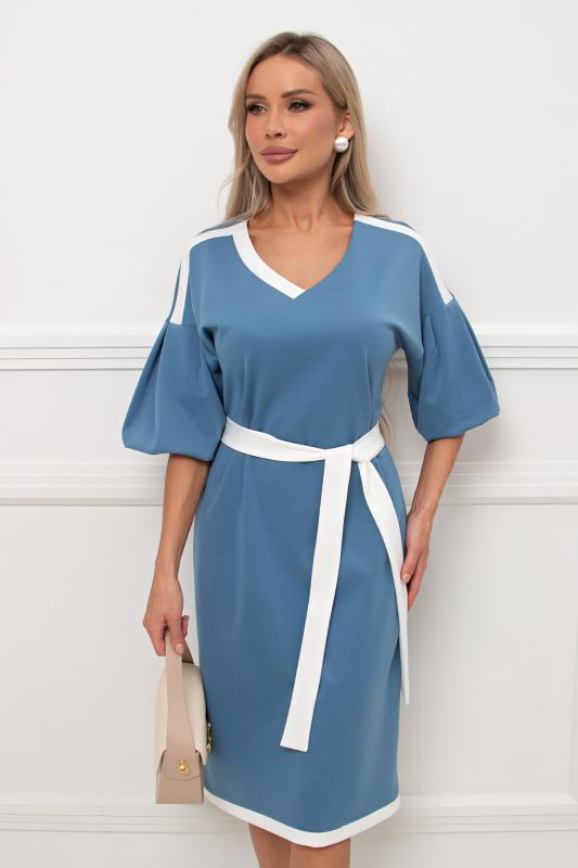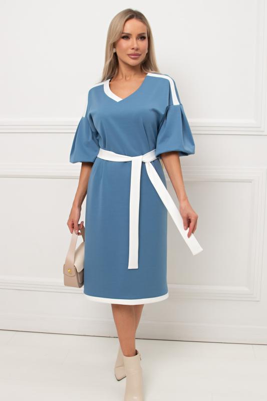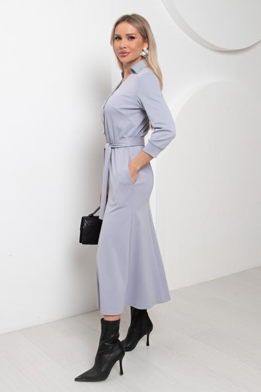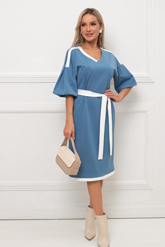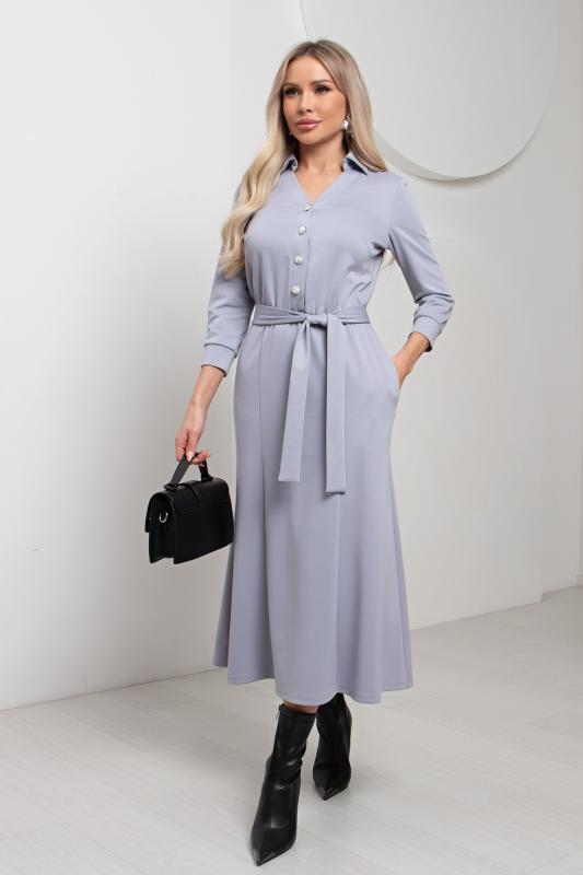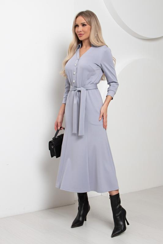 Комфортное платье прилегающего силуэта из трикотажного полотна.V-образная горловина оформлена отложным воротником на стойке. По переду планка с застежкой на петли и пуговицы. Втачной рукав длиной ¾ оформлен притачной манжетой. Юбка состоит из шести клиньев. Модель отрезная по линии талии, присборена на резинку. Пояс из основной ткани в комплекте.