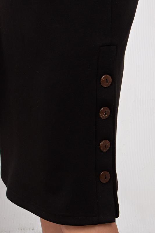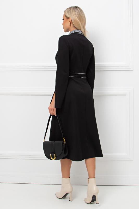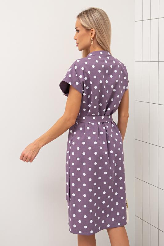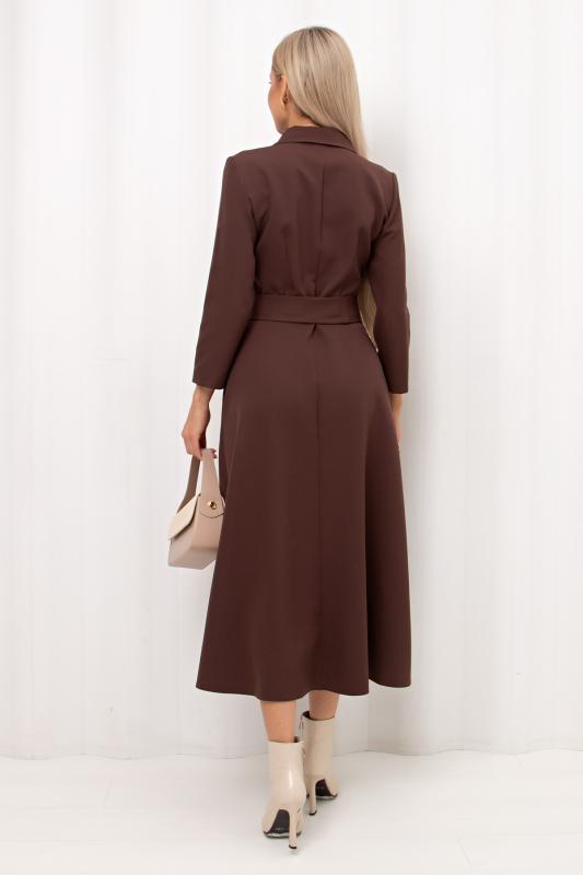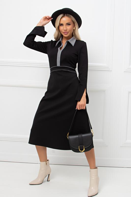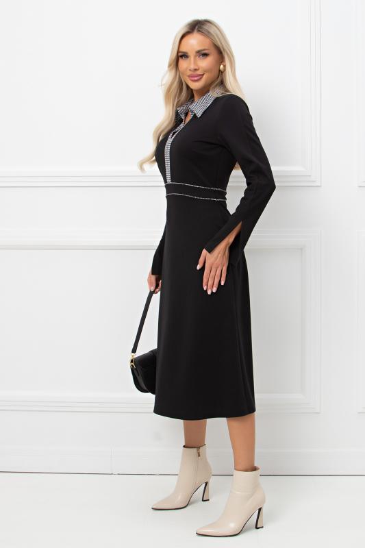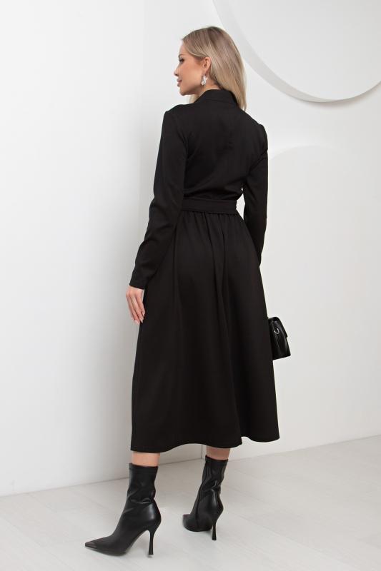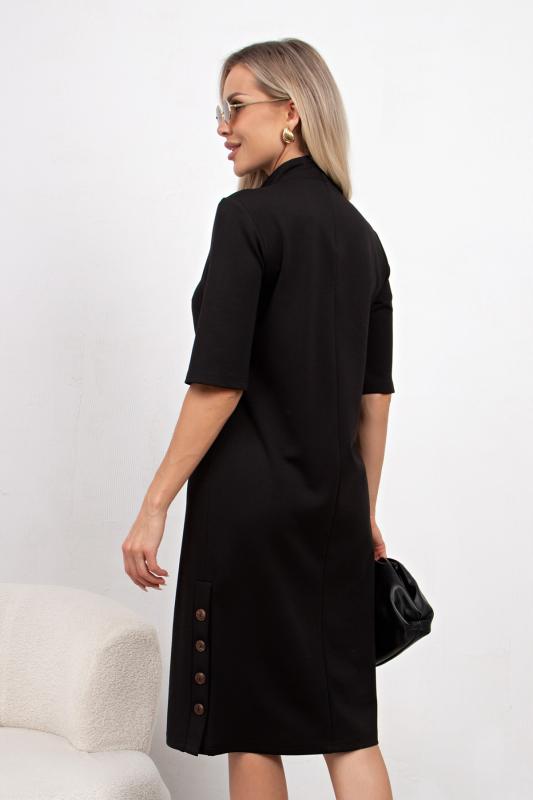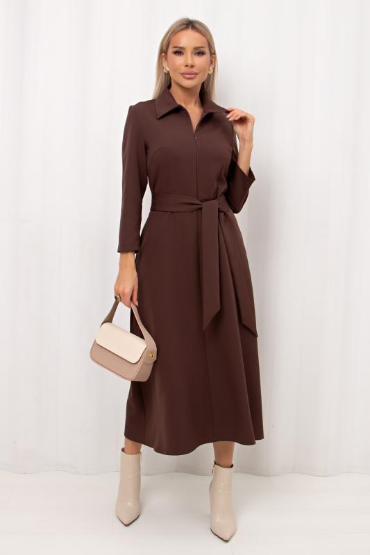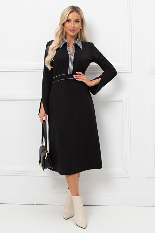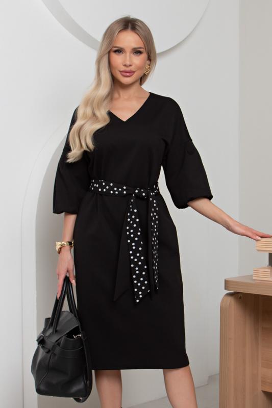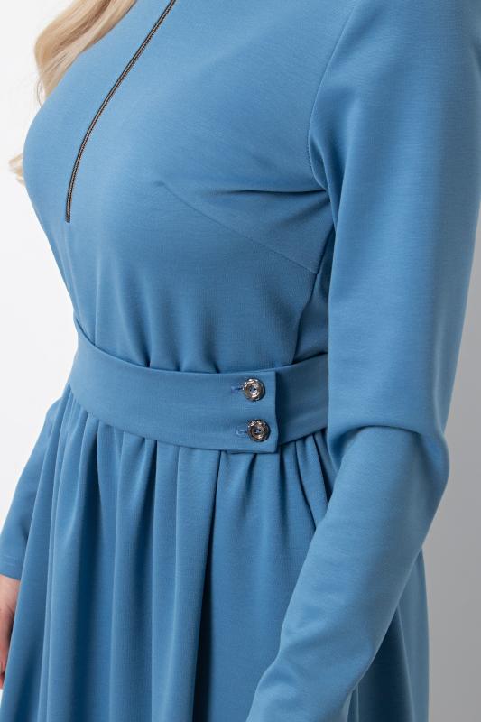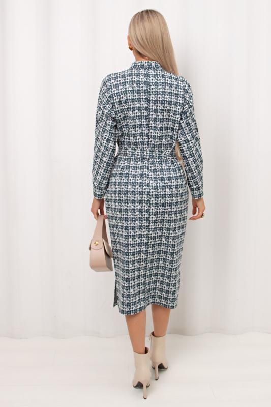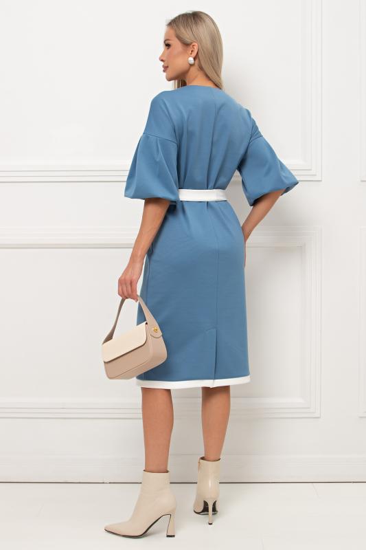 Комфортное платье прилегающего силуэта из трикотажного полотна.V-образная горловина оформлена отложным воротником на стойке. По переду планка с застежкой на петли и пуговицы. Втачной рукав длиной ¾ оформлен притачной манжетой. Юбка состоит из шести клиньев. Модель отрезная по линии талии, присборена на резинку. Пояс из основной ткани в комплекте.