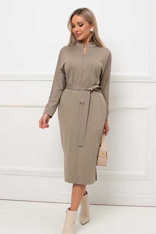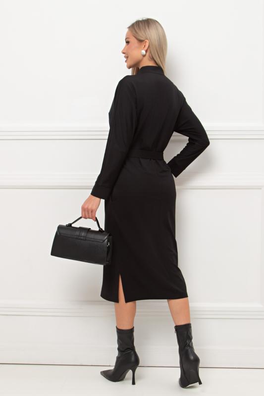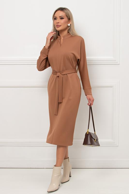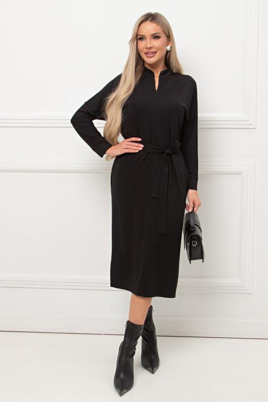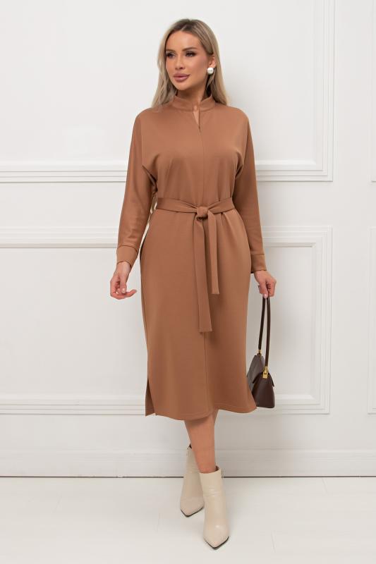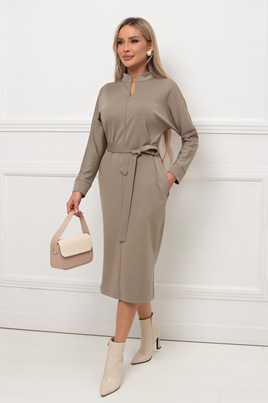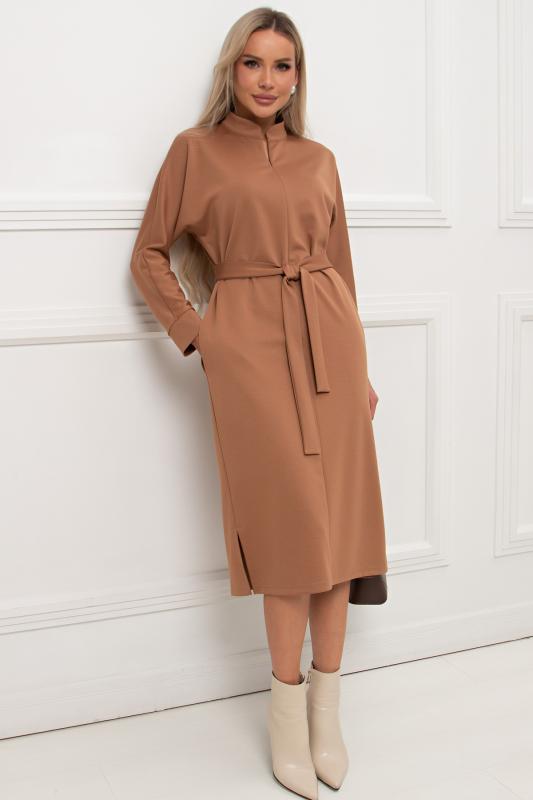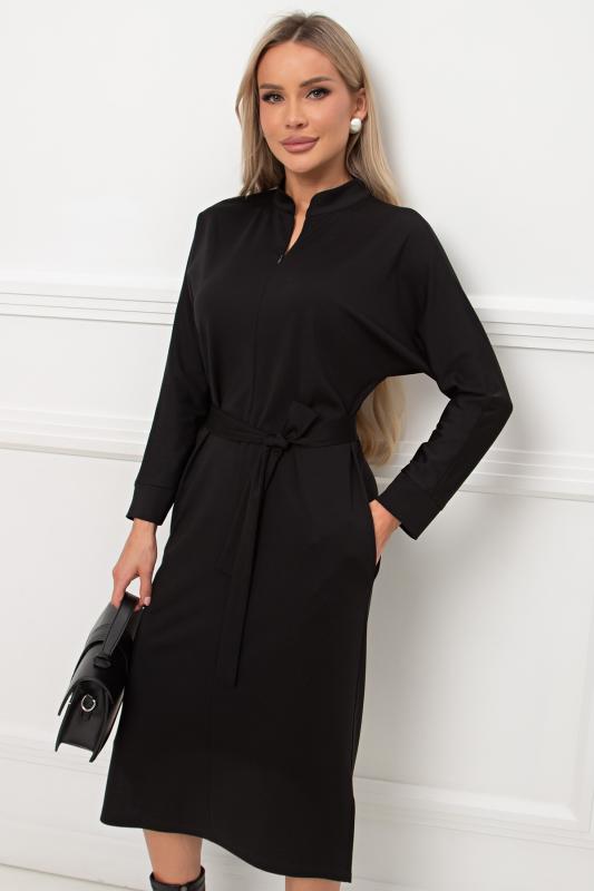 Лаконичное платье прямого силуэта выполнено из трикотажного полотна. Длинный цельнокроеный рукав летучая мышь, оканчивается притачной манжетой. Горловина оформлена воротником - стойка. По переду застежка на потайную молнию. По боковым швам расположены функциональные карманы. Низ ровный, по бокам разрезы. Пояс из основного материала в комплекте.