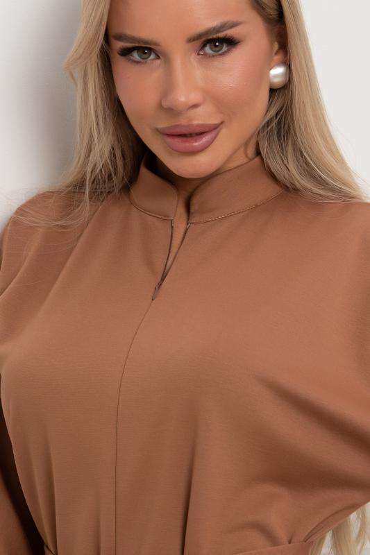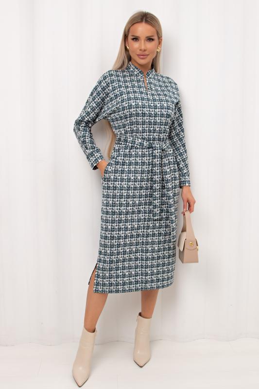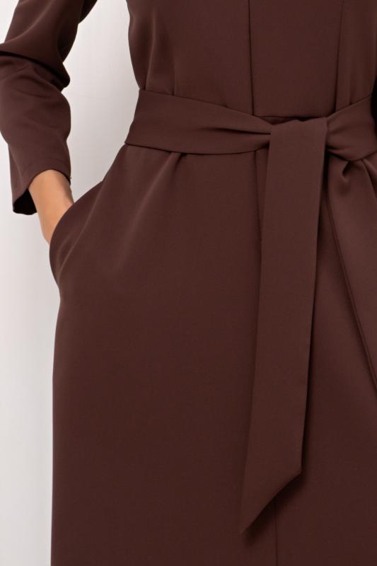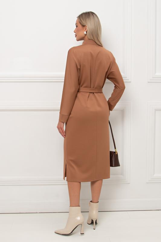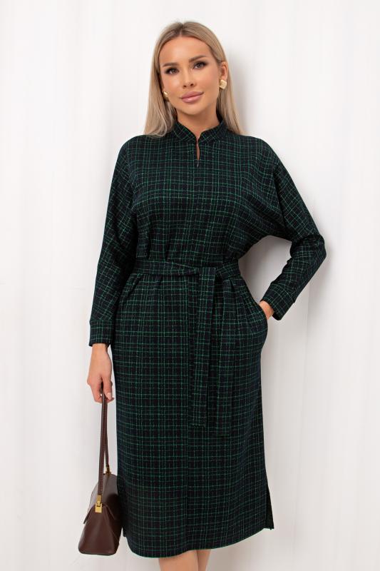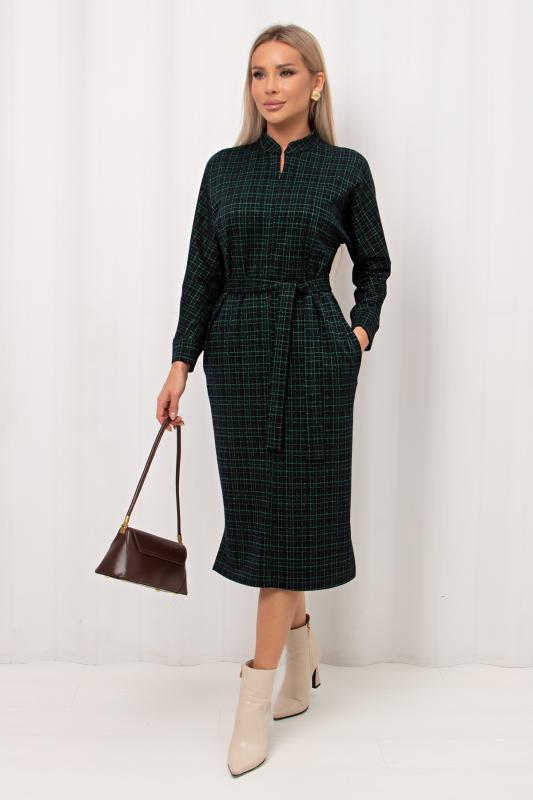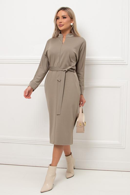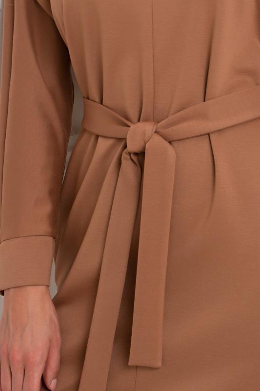 Лаконичное платье прямого силуэта выполнено из трикотажного полотна. Длинный цельнокроеный рукав летучая мышь, оканчивается притачной манжетой. Горловина оформлена воротником - стойка. По переду застежка на потайную молнию. По боковым швам расположены функциональные карманы. Низ ровный, по бокам разрезы. Пояс из основного материала в комплекте.