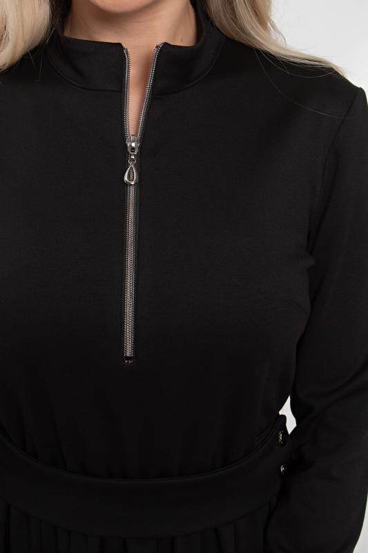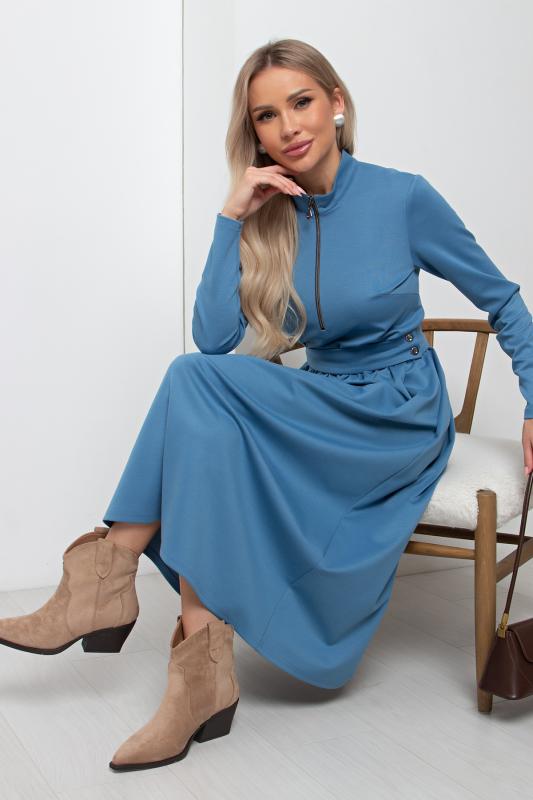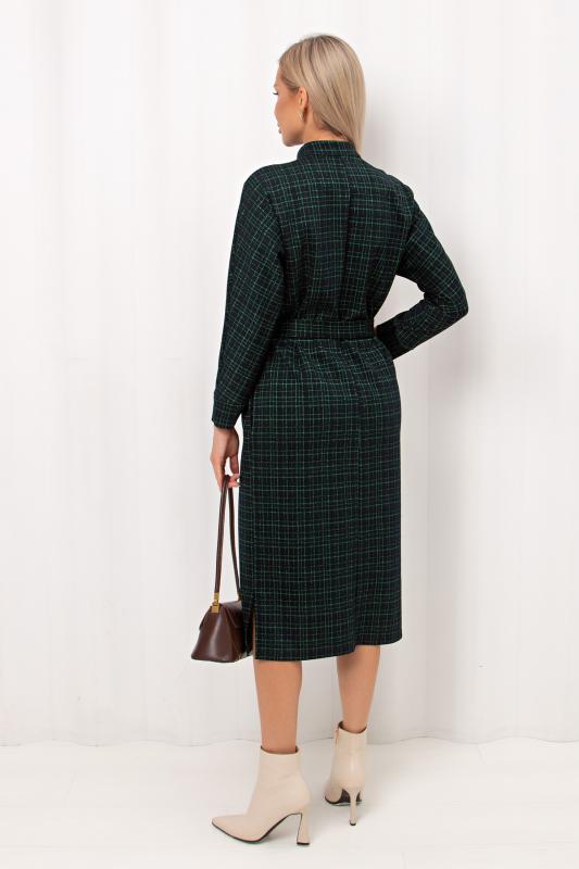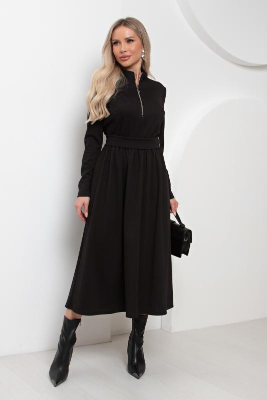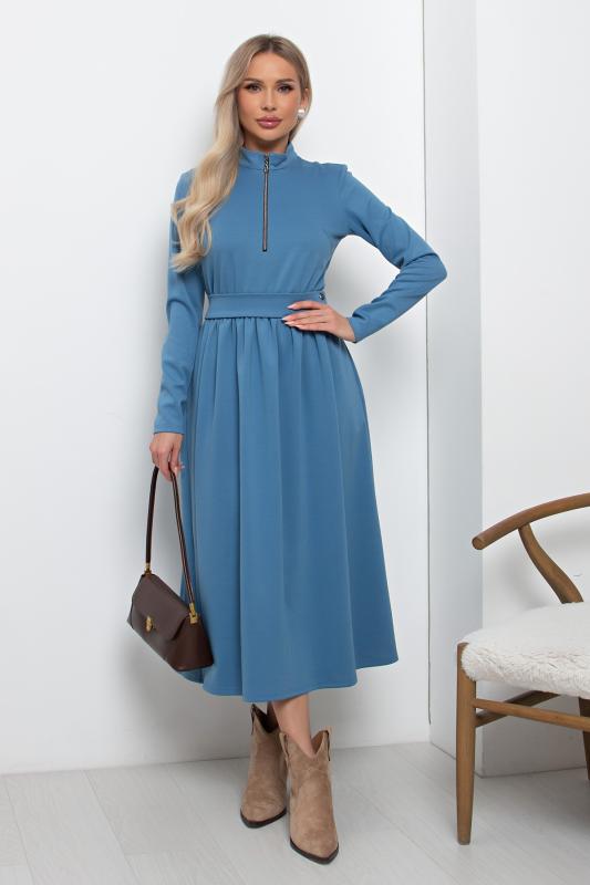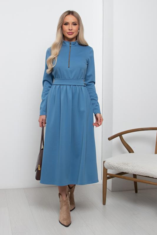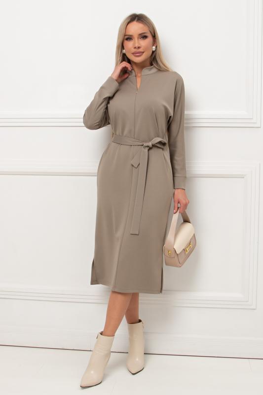 Элегантное платье приталенного силуэта из трикотажного полотна. Горловина оформлена воротником- стойкой с застежкой на молнию. Длинный втачной рукав. Модель отрезная по линии талии, присборена на эластичную резинку. В боковых швах функциональные карманы. Пояс с застежкой на петли и пуговицы. Низ ровный, без разрезов.