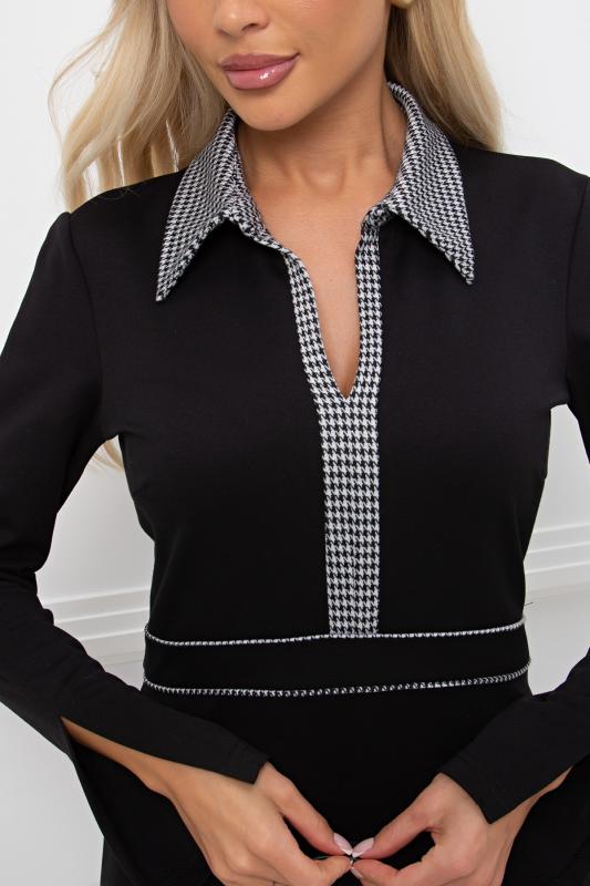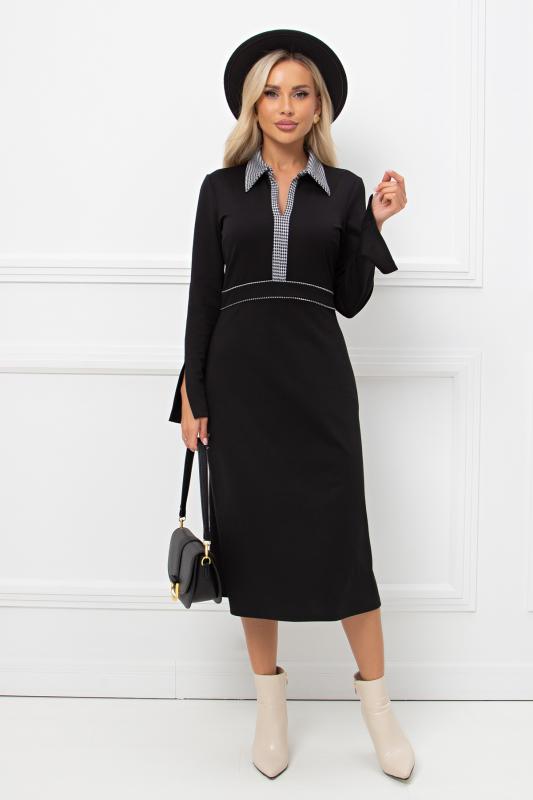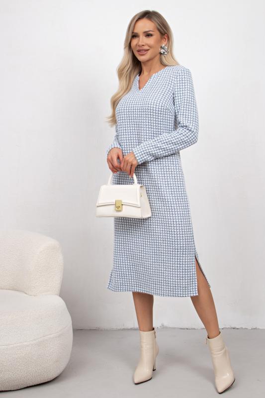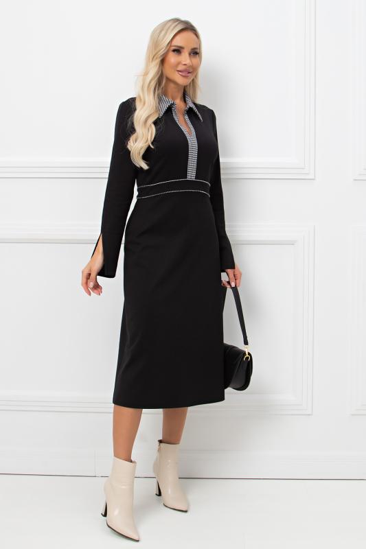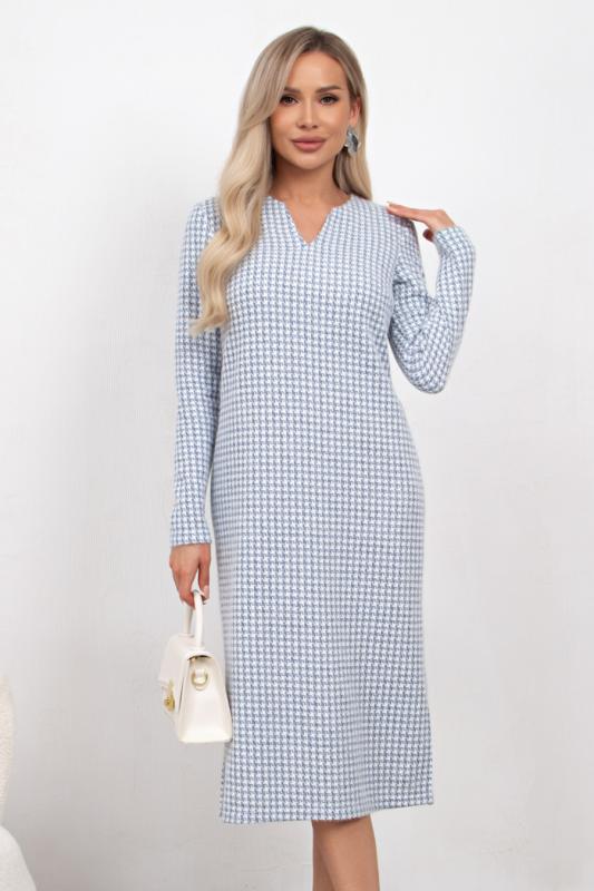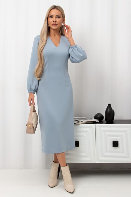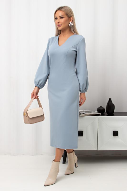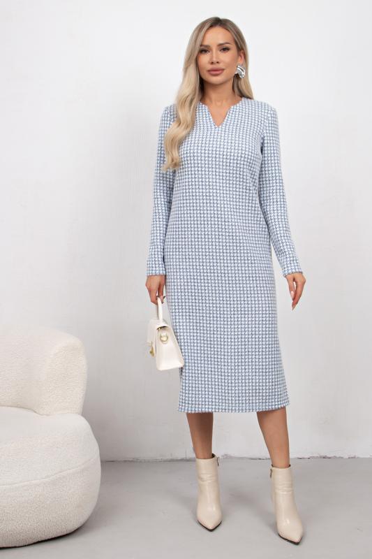 Комфортное платье прилегающего силуэта из трикотажного полотна.V-образная горловина оформлена отделочной вставкой. Длинный втачной рукав. Низ ровный, по бокам разрезы.