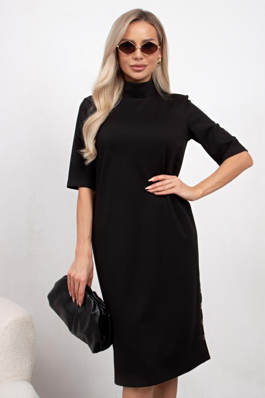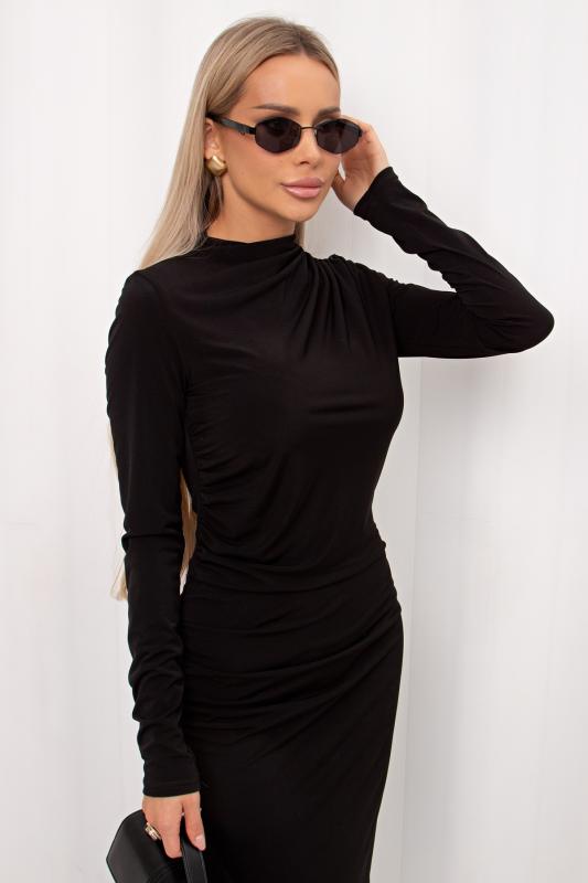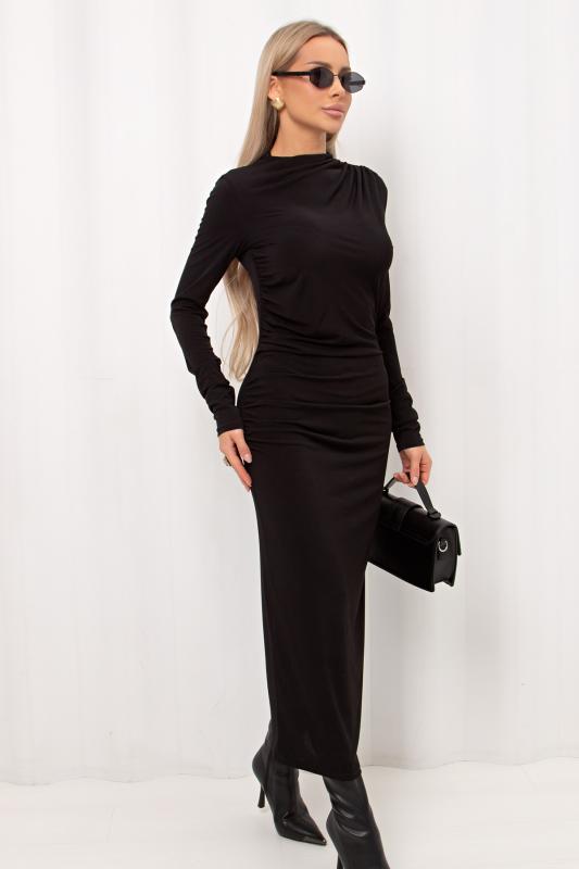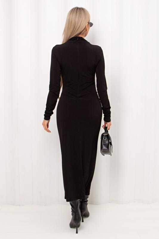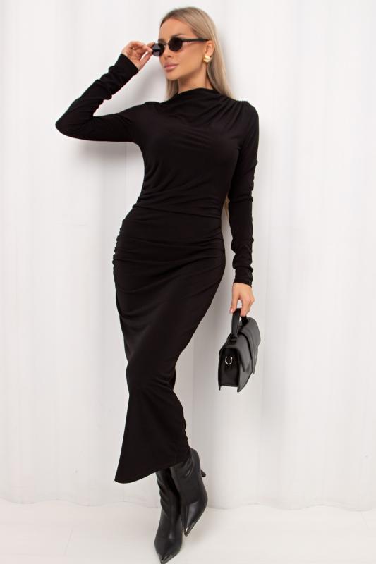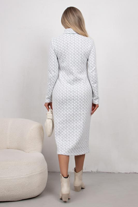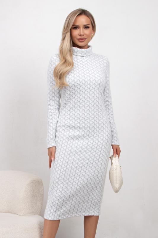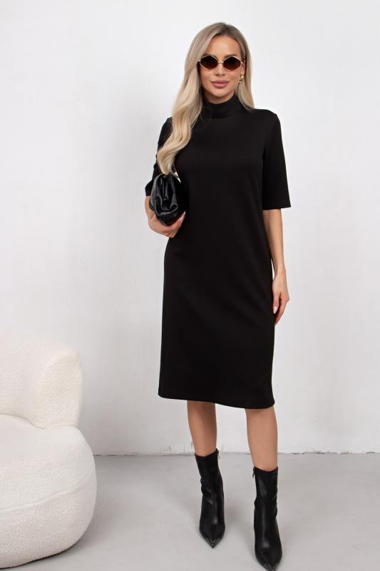 Комфортное платье прилегающего силуэта из трикотажного полотна. Длинные втачные рукава. Горловина оформлена воротником - хомут. Низ ровный, без разрезов. Модель без застежек. Практичное платье станет отличным дополнением к повседневному гардеробу.